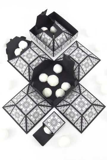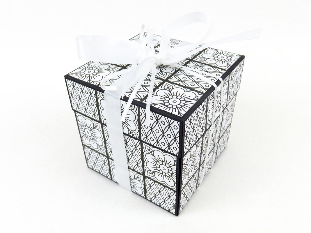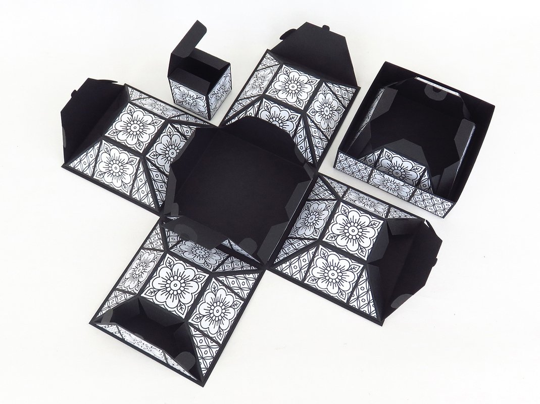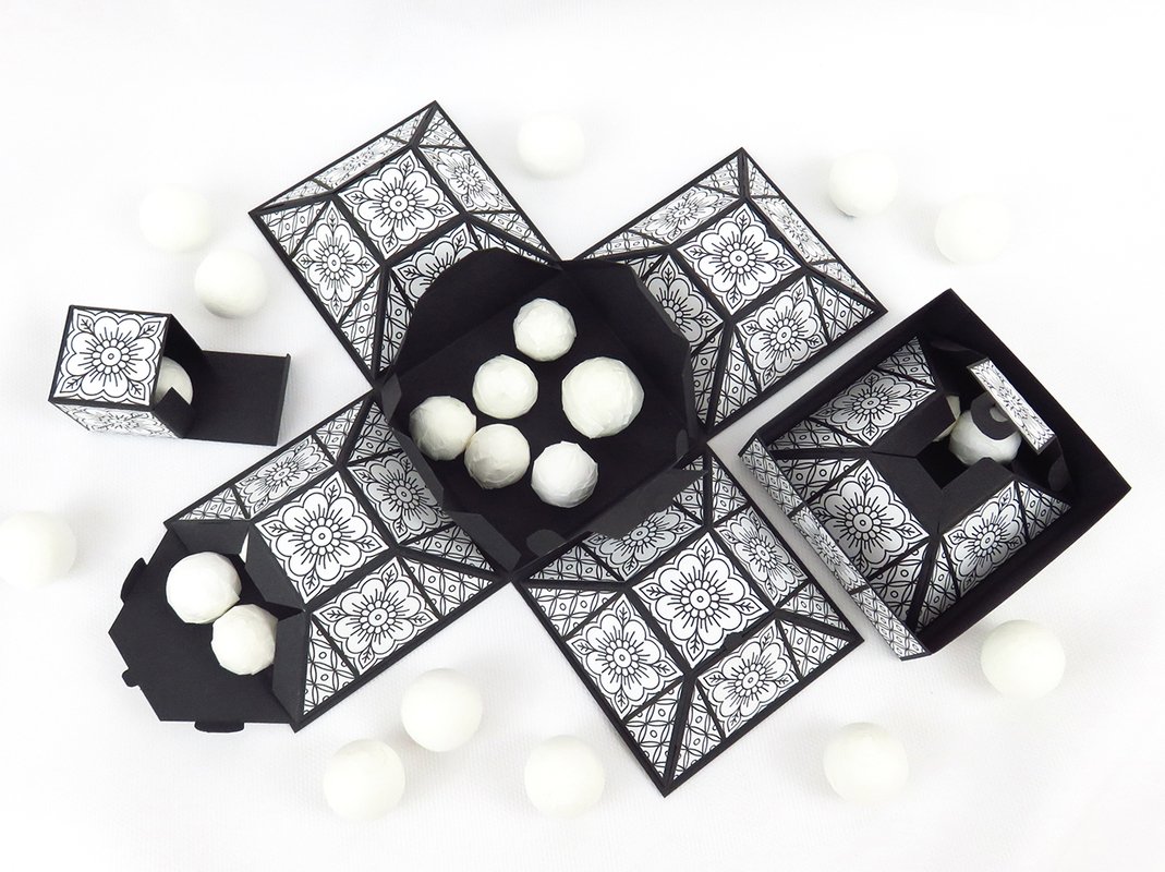 Keine Geschenkidee? Explosionsboxen gehen immer! In der hier abgebildeten Box hast du viel Platz zum Verstecken von Kleinigkeiten – Pralinen, Sammelobjekten, Schmuck, Glücksbringer usw.