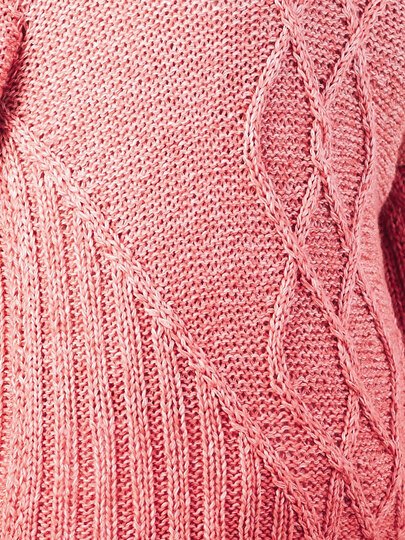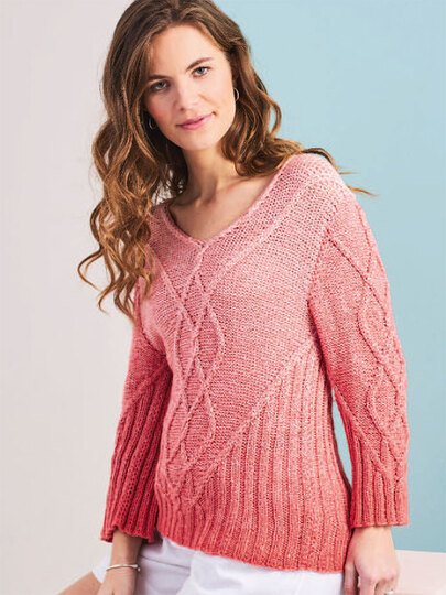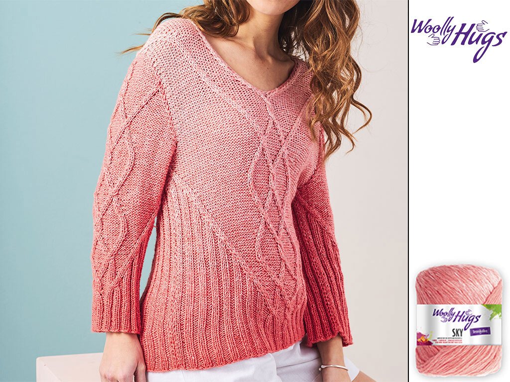 Wer Zöpfe mag und eine grafische Aufteilung eines designs, der kann an diesem Pulli nicht vorbei sehen. Die Seiten sind in einem Rippenmuster gehalten das sich leicht zusammen zieht. Das gibt dem Pulli eine besonderes tolle Passform ohne in der Bewegung ein zu schränken. Die Mitte wird durch ein großes Rautenförmiges Zopfmuster betont.