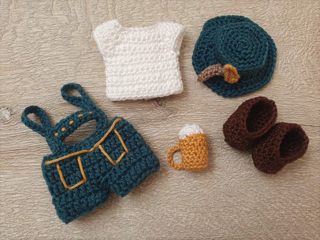 Leo liebt ihr neues Outfit. Es besteht aus der Lederhose, der Bluse, der Unterwäsche, den Schuhen, dem Hut und dem Bier. Beachte, dass Du beim Kauf dieser PDF nur die Anleitung zur Herstellung der Kleidung erhältst. Die Anleitung zur Herstellung der Puppe ist nicht enthalten!