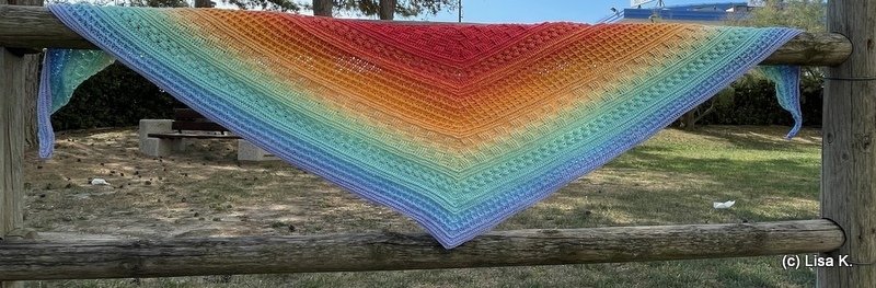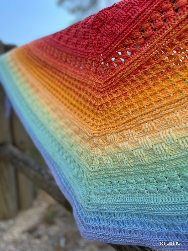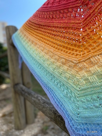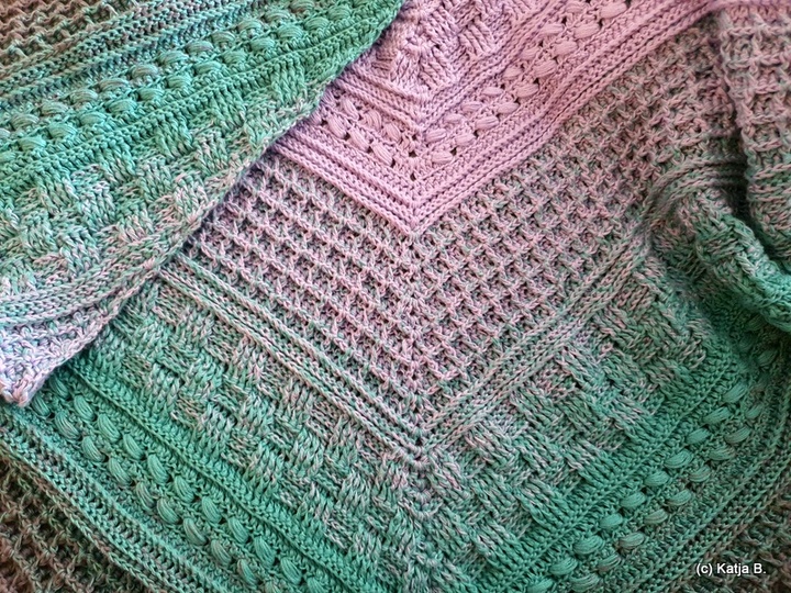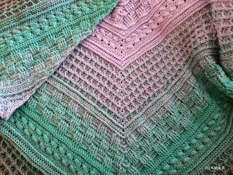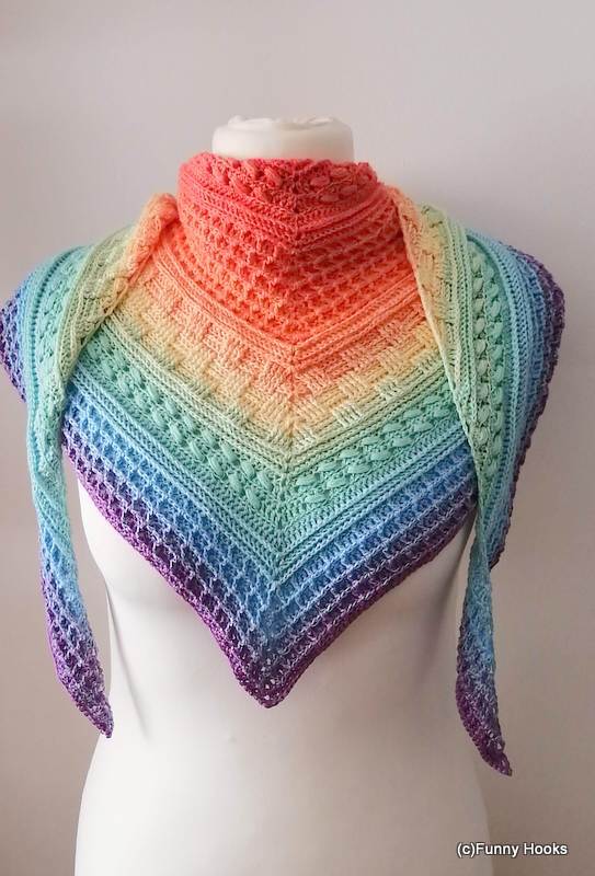 Verwendet hab ich den Funny Hooks Bobbel "Fading Rainbow", 1150 m, 3-fädig mit einer NS 3,50.