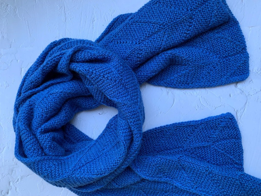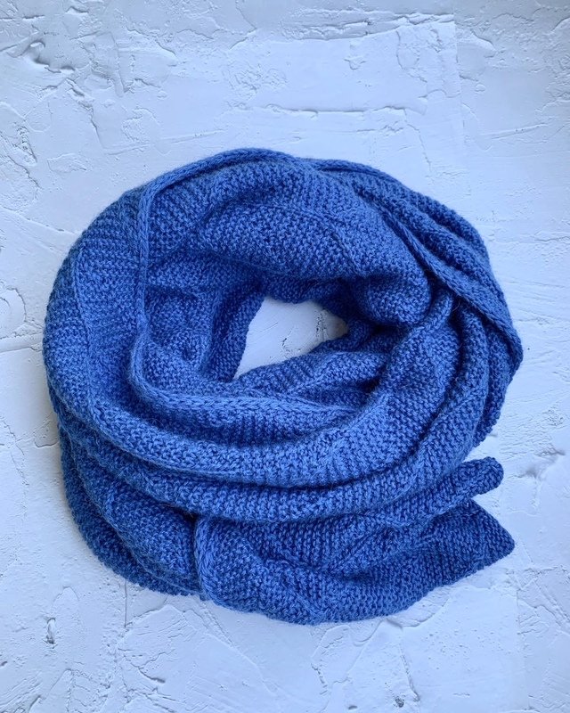 Hier wäre es beispielsweise ein Schal zum einkuscheln mit einem wunderschönem 3 D-Muster. Der blaue Ton strahlt und harmoniert doch überraschen gut. Du kannst natürlich auch eine ganz andere Farbe wählen.