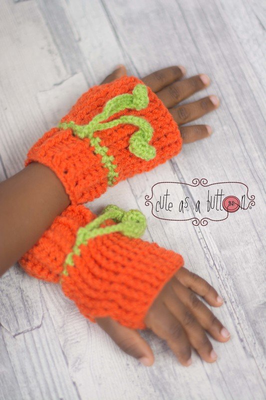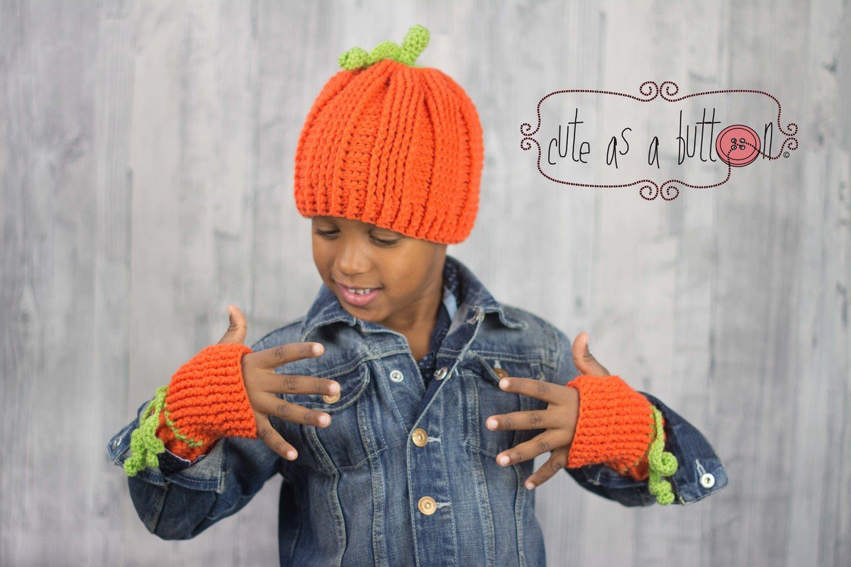 Bebilderte Schritt-für-Schritt-Anleitung für die Kürbismütze und fingerlose Handschuhe.