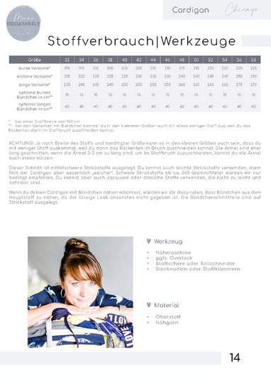 Dieser Schnitt ist mittelschwere Strickstoffe ausgelegt. Du kannst auch leichte Strickstoffe verwenden, dann fällt der Cardigan aber wesentlich „weicher“. Schwere Strickstoffe ab ca. 360 Gramm/Meter würden wir nur bedingt empfehlen. Du kannst aber auch Jacquard oder ähnliche Stoffe verwenden, die nicht zu leicht und dehnbar sind.