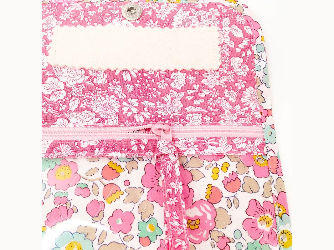=> Eine Nadelauflage. Hier passt die benötigte Anzahl von Nadeln für unterwegs. Optional können Zierknöpfe an den Seiten angenäht werden. Das ist nicht nur dekorativ, sondern auch nützlich. Sollte z.B. Garn an der Nadel übrig bleiben, kann es um den Knopf gewickelt werden, damit es nicht „frei“ in der Tasche hängt und eventuell auch stört.
