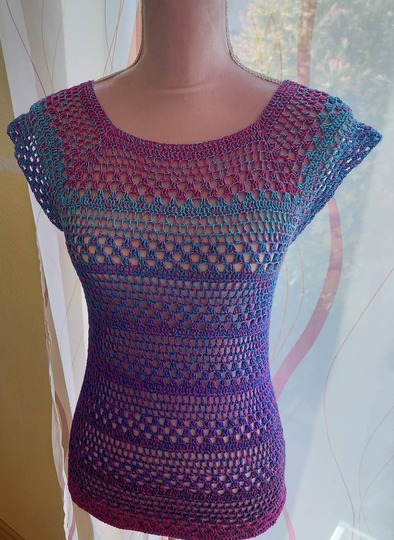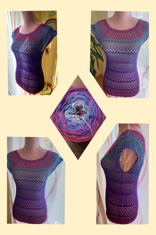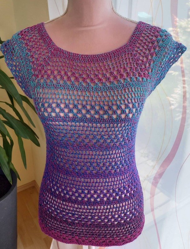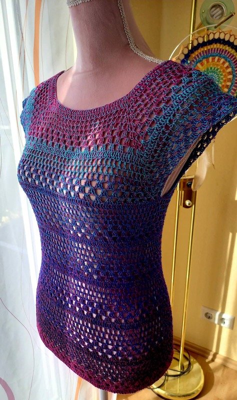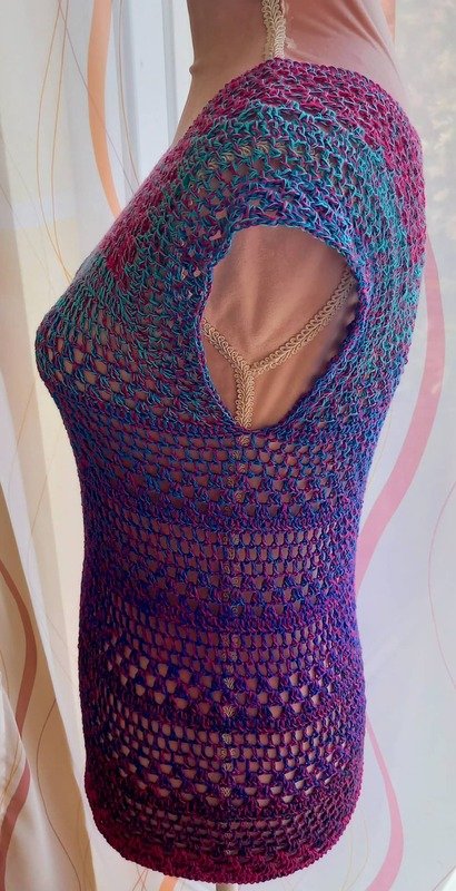 Da die Tunika im RVO-Stil (Raglan von oben) gehäkelt wird, ist dies aber in jeder beliebigen Größe ohne mühseliges Umrechnen möglich. Die Größe entscheidet sich durch das Schließen der Armausschnitte.
