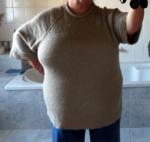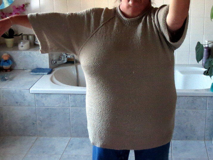 Der Pulli hat die Größe 54/56 und ist etwa 80cm lang. Durch die halblangen weiten Ärmel und das feine Merinogarn ist er ideal für den Übergang, wärmend aber trotzdem schön leicht.
