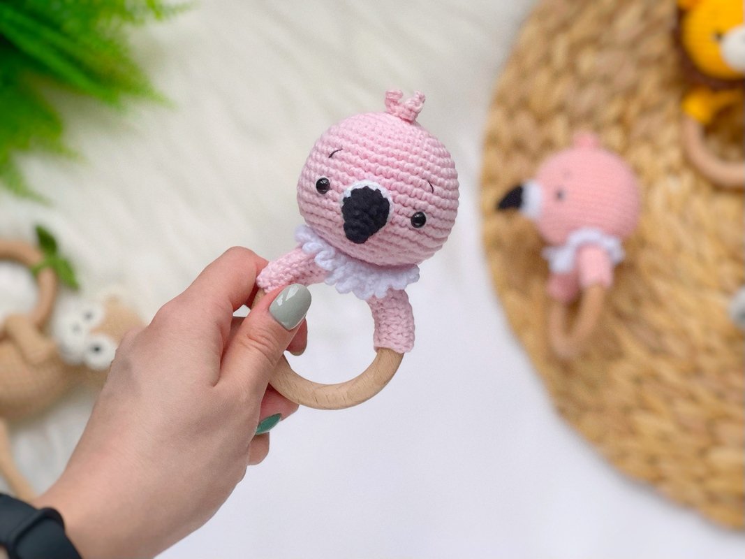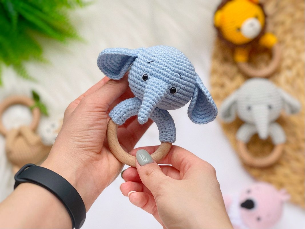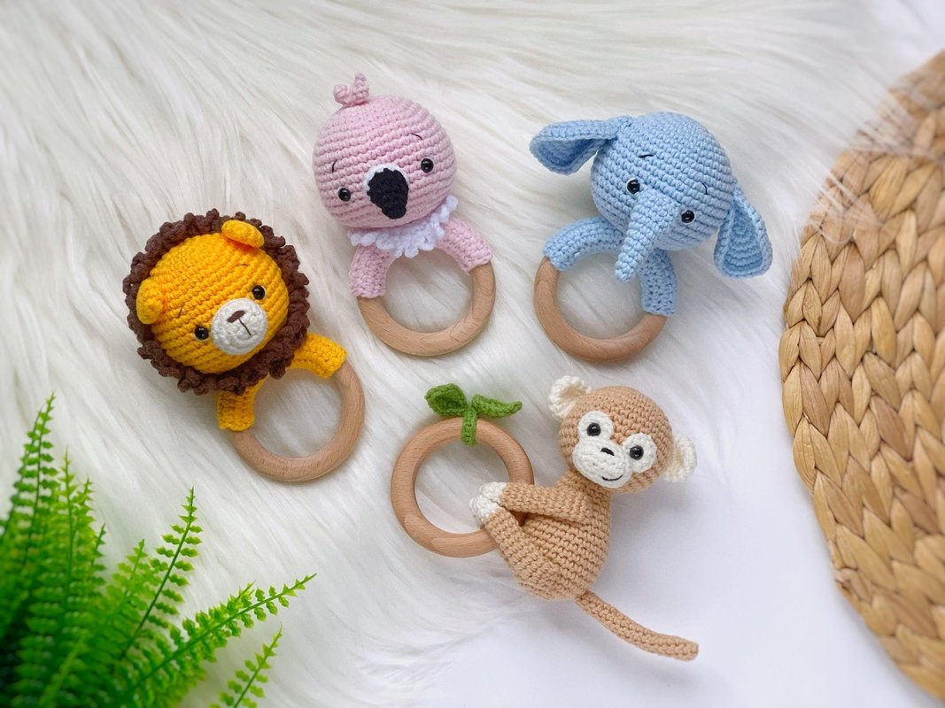 Dieses Set enthält Häkelanleitungen: Rassel-Elefant, Rassel-Affe, Rassel-Flamingo, Rassel-Löwe