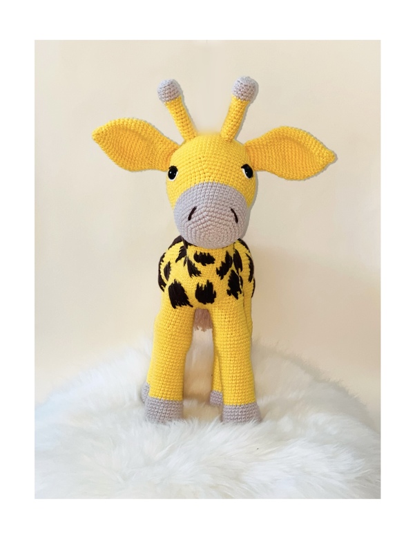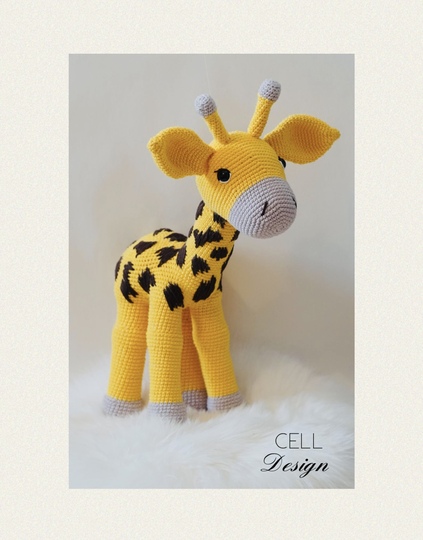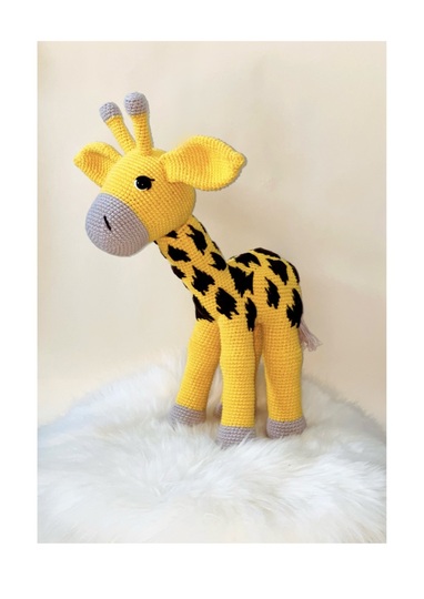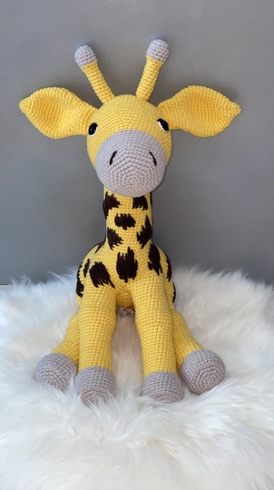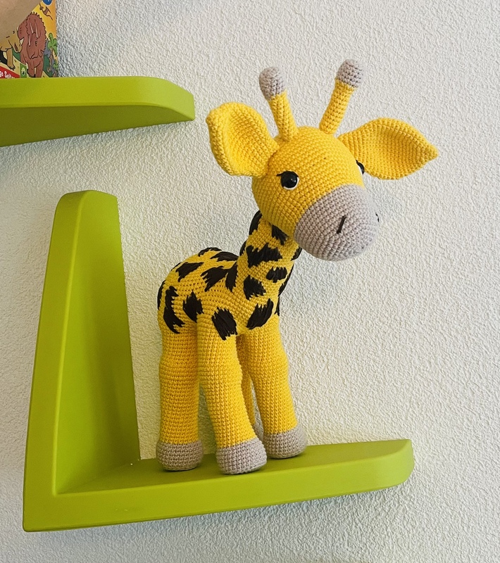 Mit dieser Häkelanleitung wird im Detail erklärt, wie die Giraffe anzufertigen ist. Die Anleitung umfasst 18 Seiten und ist mit zahlreichen Fotos (50) ausgearbeitet. Nur der Kopf, die Ohren und die Hörner werden angenäht. Zusätzlich werden die Flecken aufgestickt.