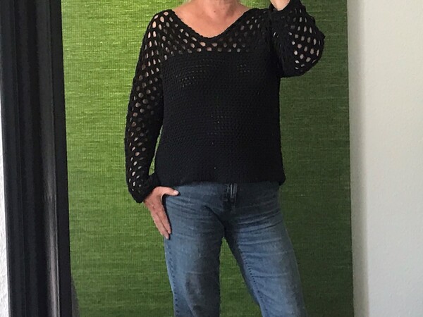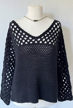 Das Shirt ist in drei Häkel-Mustern gehäkelt, nach oben hin immer luftiger werdend. Es besteht aus 2 Teilen.