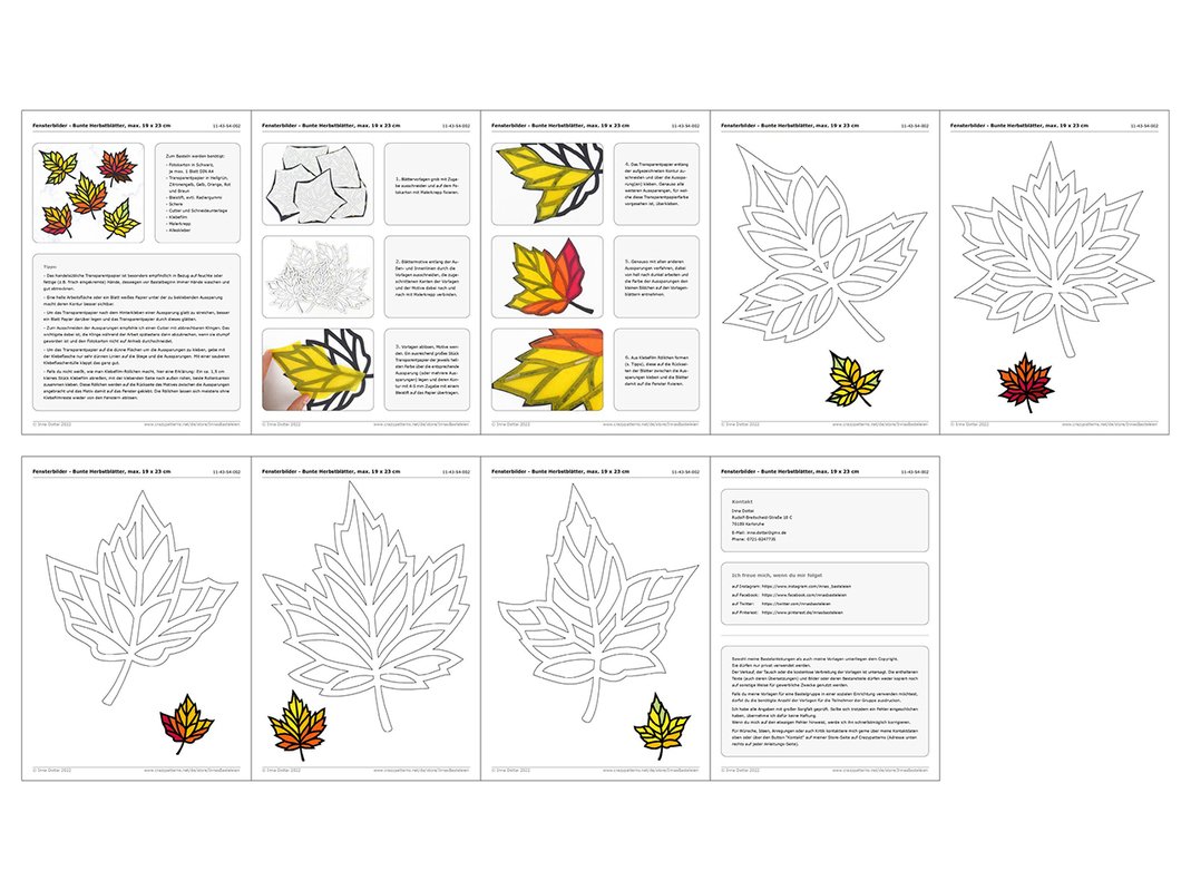 Um diese Blätter nachzuarbeiten, sollst du mit Schere und Cutter umgehen können. Auch sollst du bereits mit Transparentpapier und Klebstoff gearbeitet haben. Unter diesen Voraussetzungen wirst du diese Fensterbilder ohne Mühe nacharbeiten können.