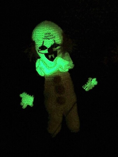 Wer Horrorgestalten an Halloween mag, dem gefällt bestimmt auch diese Dekoration.Das Besondere daran: Die weißen Teile (Kopf, Kragenund Hände) leuchten im Dunkeln! Das macht das Ganze noch gruseliger.