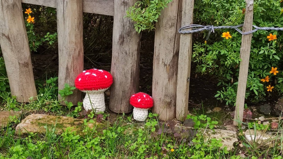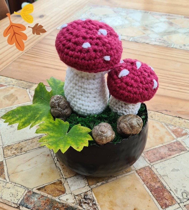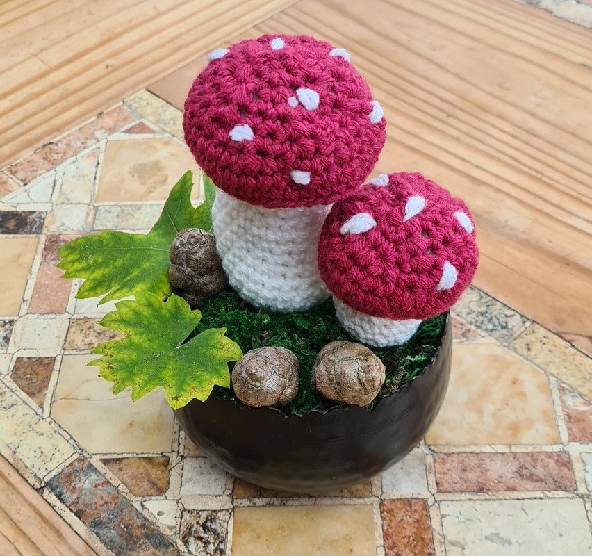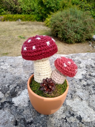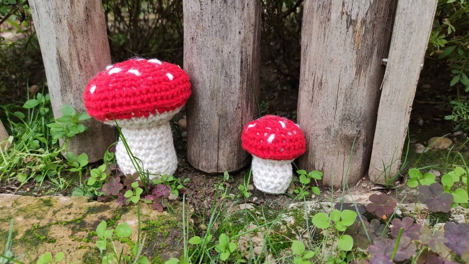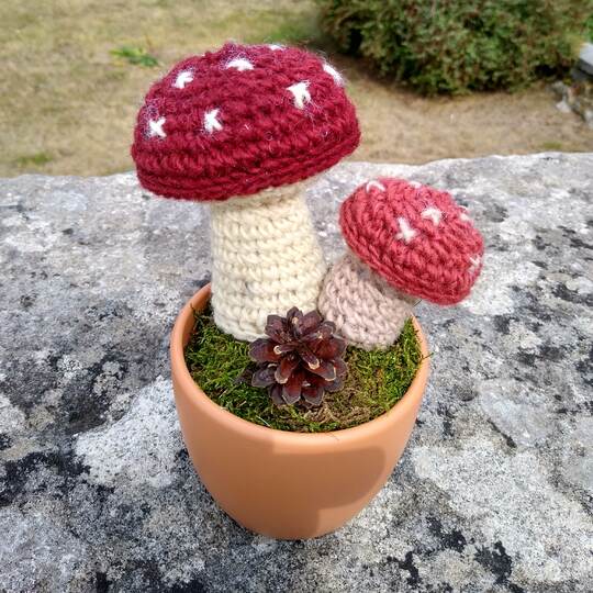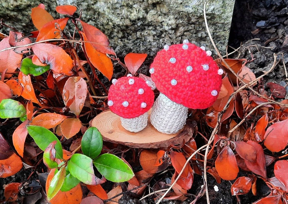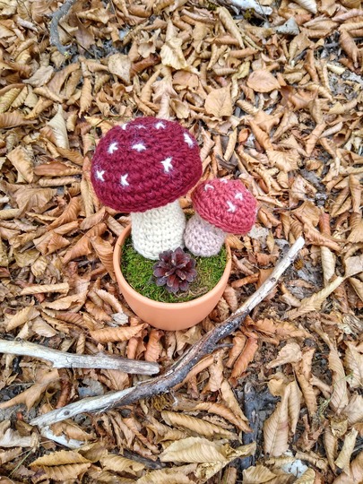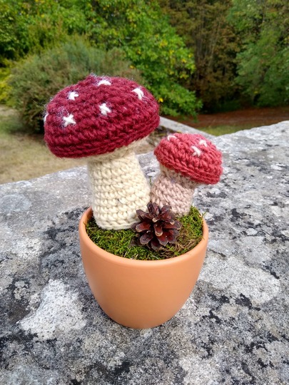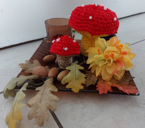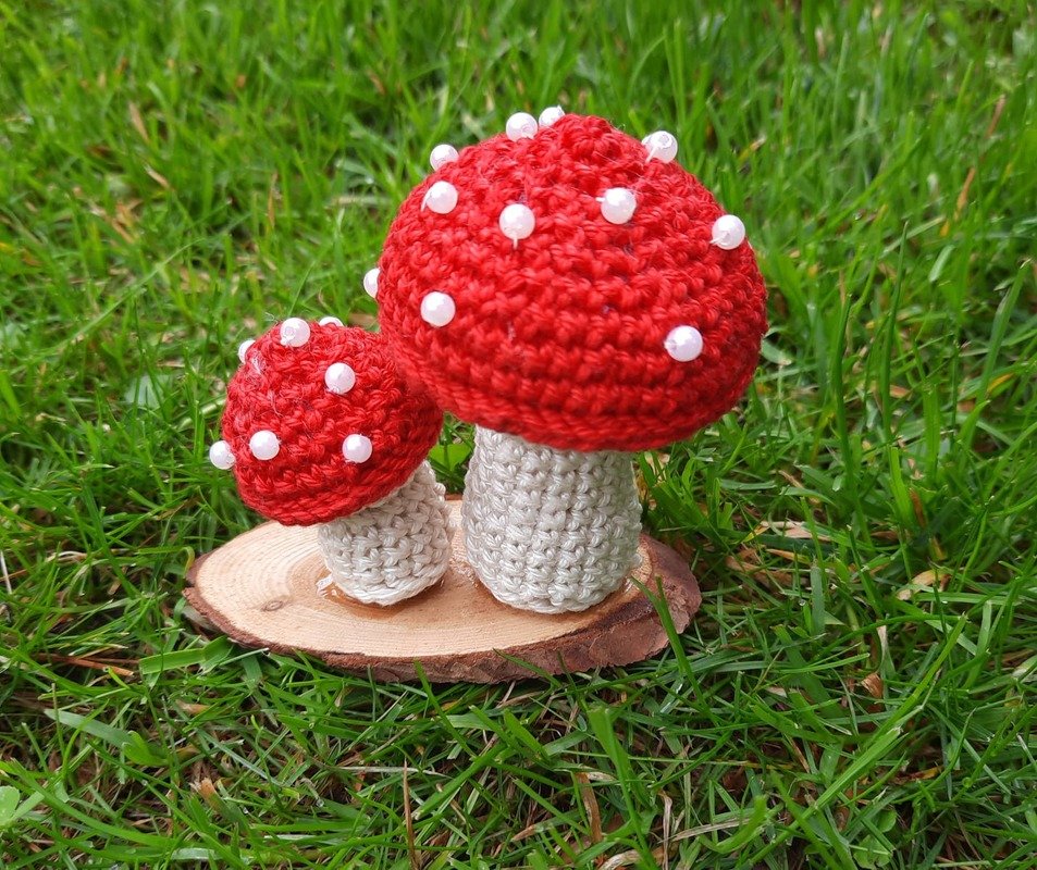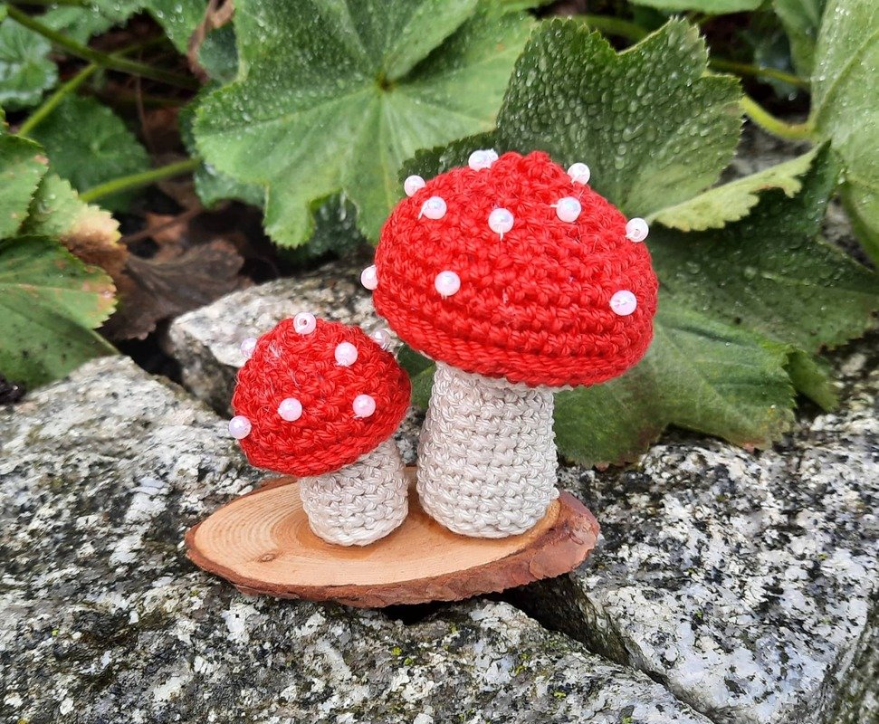 Der große Pilz hat eine Höhe von ca. 10 cm, der kleine Pilz von ca. 6 cm. Je dünner bzw. dicker das verwendete Garn ist, desto kleiner bzw. gößer werden die Pilze.