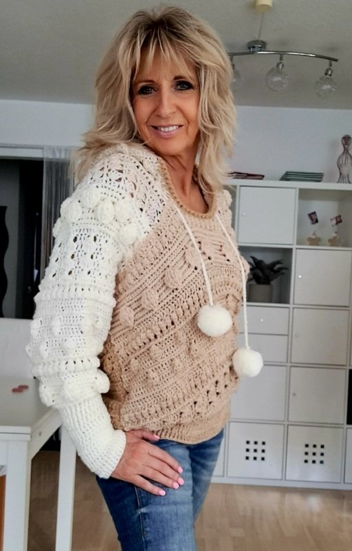 Verarbeitet mit 8fädigem oder 6fädigem Farbverlaufsgarn ist der Hoodie schön kuschelig.