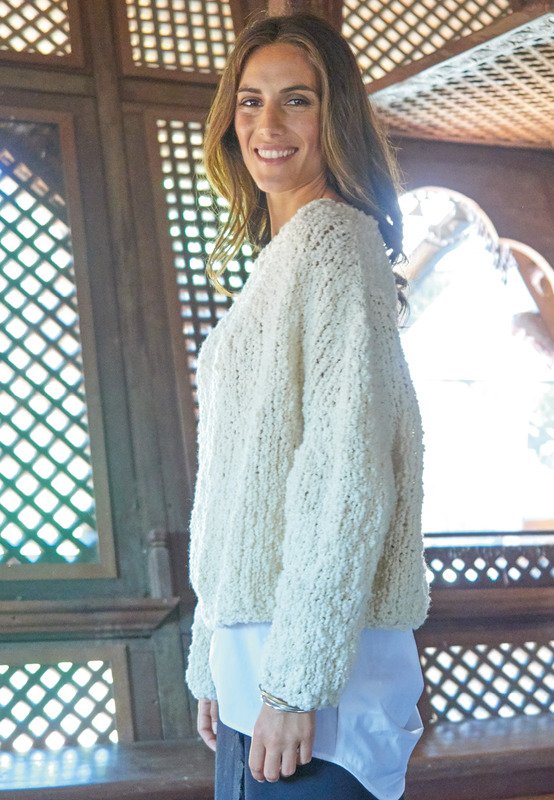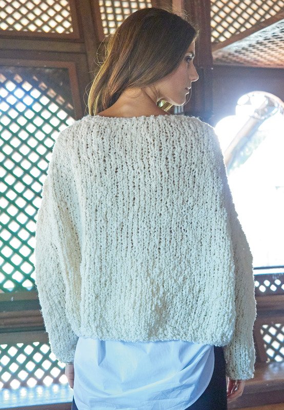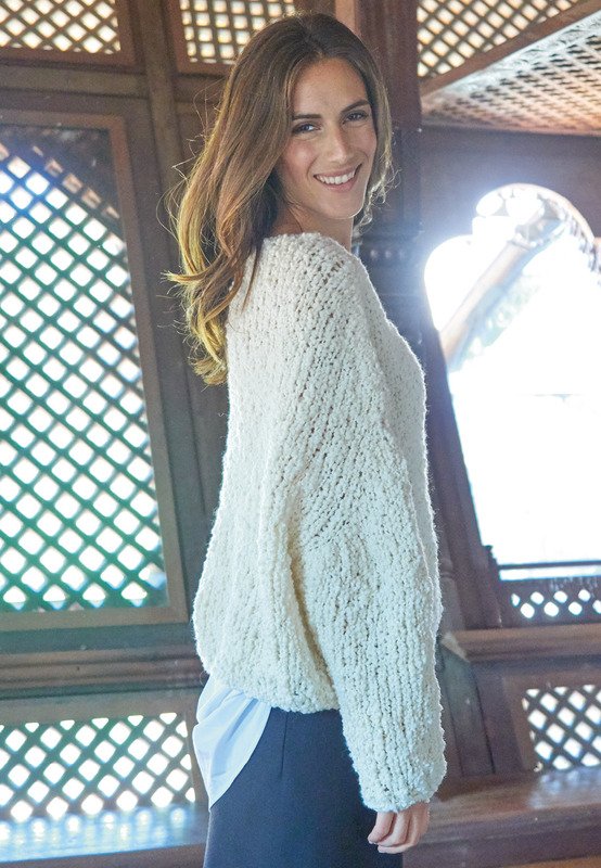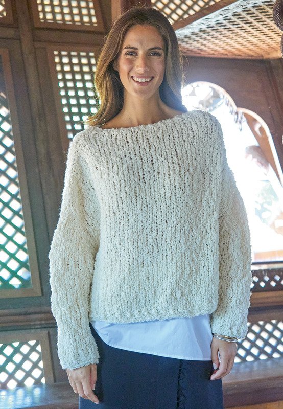 Das ungleichmäßig gesponnene Garn gibt dem Pullover in Boxy-Form eine lebendige Oberfläche. Die Bündchen sind schmal gearbeitet, und der U-Boot-Ausschnitt umspielt elegant den Hals. Von oben nach unten und nahtlos gestrickt, lässt sich nicht nur die Länge super anpassen – auch die Passform kann durch Anprobieren spielend leicht kontrolliert werden. Begonnen wird mit dem Halsbündchen, dann geht es immer in Runden mit den Zunahmen der Passe weiter. Hier erleichtern Maschenmarkierer den Überblick. Ist die Passe beendet, werden die Maschen für die Ärmel stillgelegt und der restliche Teil des Körpers gearbeitet – mit Nadelstärke 9 geht das richtig schnell! Danach noch aus den zuvor stillgelegten Maschen die Ärmel herausstricken – auch hier helfen Maschenmarkierer dabei, den Rundenbeginn und die richtige Platzierung der Abnahmen zu markieren. Den Abschluss bildet wieder ein schmales Rippenbündchen.