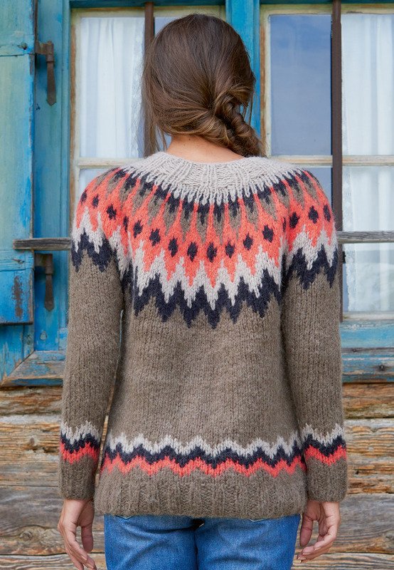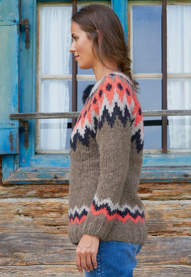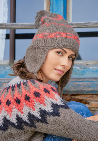 Der klassische Island-Pullover mit Rundpasse kommt durch das leuchtende Pink ganz groß raus. Der Farbton, der eigentlich etwas aus der Reihe tanzt, bringt das Muster richtig zum Strahlen. Die Mütze im peruanischen Folklore-Look macht das Set perfekt. Chullos – oder auch Ohrenklappenmützen – waren in der Vergangenheit übrigens Teil der traditionellen Männerkleidung in den Andenregionen und gaben dort über Muster und Form Informationen über den gesellschaftlichen Status ihres Trägers. Der Pullover wird bis zur Rundpasse in Reihen von unten nach oben gearbeitet, danach wird die Passe über alle Teile in Runden bis zum Halsausschnitt gearbeitet. Das Muster ist hierbei nicht allzu komplex und die übersichtliche Strickschrift hilft zusätzlich dabei, stets den Überblick zu behalten. Für die Mütze werden zunächst beide Ohrenklappen gestrickt, dann bei dem Maschenanschlag für die Mütze direkt mit eingestrickt. Zum Schluss bekommen die Ohrenklappen noch jeweils einen Flechtzopf angenäht und die Spitze der Mütze ihre Fransen.