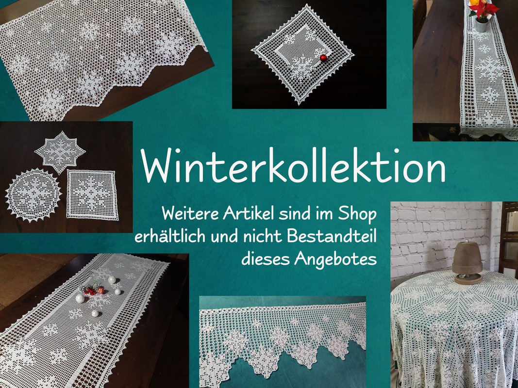 Wenn die weiße Pracht noch auf sich warten lässt, holst Du Dir ein paar Flocken ins Zimmer. Die runde Schneeflockendecke passt wunderbar zu Gardine, Mitteldeckchen, Tischband, Läufer und Minideckchen meiner Winterkollektion. Diese Anleitungen findest Du auch hier im Shop.