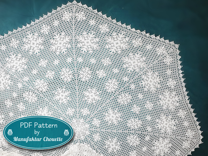 1 PDF- Datei Häkelanleitung Runde Decke Schneefall mit Zeichenerklärung, 3-teiligem Zählmuster, Schema und Text für den Anfang und die Umrandung.