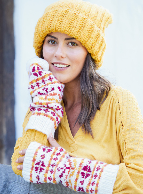 Maisgelb und extragroß ist diese Wollmütze mit breiter Krempe. In Halbpatent gestrickt bekommt sie noch mehr Volumen. Gestrickt wird sie in Runden mit doppeltem Faden – das ist ganz einfach und geht mit Nadelstärke 10 super schnell. Die Armstulpen sind ideal, wenn die Mantelärmel mal zu kurz sind, aber auch sonst wärmen sie ungemein und blitzen hell unter der Jacke hervor. Das Muster hat eine skandinavische Anmutung und wird ebenso in Runden gestrickt. Die übersichtliche Strickschrift hilft dabei, das Muster und die Farbwechsel im Blick zu behalten.