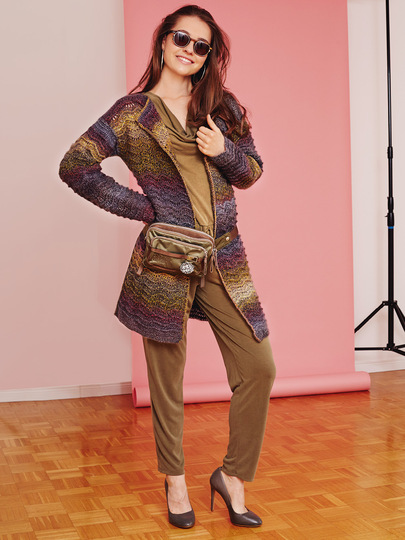 Wow! Diese verschlusslose Jacke mit wunderschönen Farbverlauf sieht kompliziert aus und ist ganz einfach. Das Wellenmuster ergibt sich beim Häkeln von Stäbchen und Reliefstäbchen ganz allein. Es werden im Wechsel Maschen übergangen und mehrere Maschen in eine Masche gehäkelt. Durch den Farbverlauf kommen die Wellen dann so richtig gut zur Geltung. Die langärmelige Jacke ist ganz gerade und der Umschlagkragen an den Vorderteilen bedarf keiner Abnahmen. Hervorstechen die umhäkelten Kanten und die zusammengehäkelten Nähte. Das Garn ist von Austermann, wird mit Nadel Nr 5 gehäkelt und die Anleitung ist für die Größen 36, 38, 40, 42, 44 und 46.