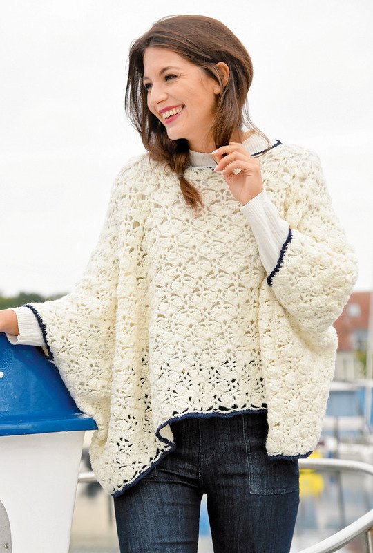 Unverzichtbar ist dieser aufsehenerregende Poncho und ein „Must have“ im Kleiderschrank. Mit Wollmischgarn gehäkelt hält er warm, ohne zu warm zu werden. Genau das Richtig für den Übergang. Zudem ist er ein perfektes Modell für alle, die im Häkeln noch nicht so versiert sind. Das Muster, an Muscheln erinnernd, besteht aus Stäbchengruppen, die in eine Masche gehäkelt werden. Spätestens nach dem Erstellen der Maschenprobe, dürfte es kein Problem mehr sein. Und dann braucht nur ganz gerade gearbeitet werden. Für den Ausschnitt bleiben die Maschen einfach unbehäkelt. An deren Stelle, werden Luftmaschen gearbeitet, die in der Rückreihe dann wieder im Muster eingefügt werden. Und damit der Poncho beim Windstoß nicht gleich über den Kopf fliegt, werden die Seiten, bis auf die Armausschnitte geschlossen. Die Kanten werden mit einfachen festen Maschen und Krebsmaschen in Blau umhäkelt. Gearbeitet wird mit Nadelstärke Nr 5,5 und Garn von Junghans-Wollversand. Die Anleitung gilt für die Größe 36, 38, 40, 42, 44 und 46.