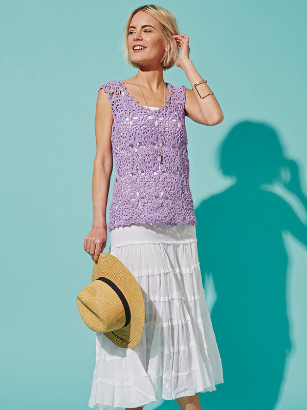Ein Top mit vielen Möglichkeiten. Ob solo oder z.B. über einer Bluse, Kleid oder Shirt getragen, immer fallen die wunderschönen Grannys ins Auge. Für diese häkelt man zu Beginn 4 Luftmaschen, die zum Kreis geschlossen werden. Anschließend häkelst du in 5 Runden das Granny fertig. Dann benötigist du noch halbe Grannys, einmal quer und einmal längs geteilt. Da es für alle drei gut lesbare Häkelschriften gibt, dürfte es kein Problem sein. Ab den 2. Granny fängst du gleich an, alle folgenden mit den zuvor gearbeiteten zusammen zu häkeln. Zum Schluss hast du dein neues Top schon fertig. Die Nähte hast du schon geschlossen, nun musst du nur noch die Kanten umhäkeln. Du häkelst mit Nadeln Nr 3. Die Anleitung gilt für die Größen 36, 38, 42 und 44.
