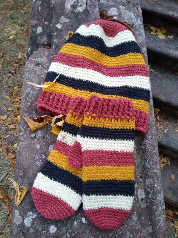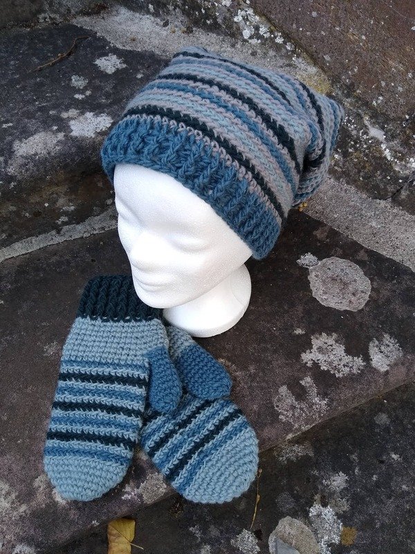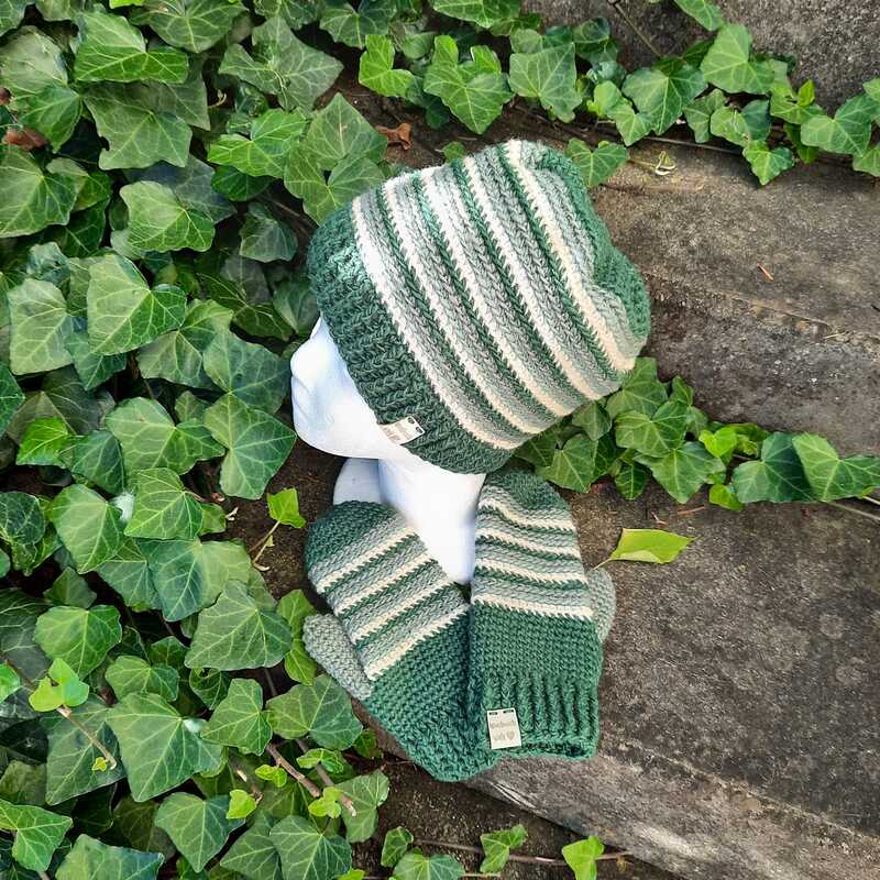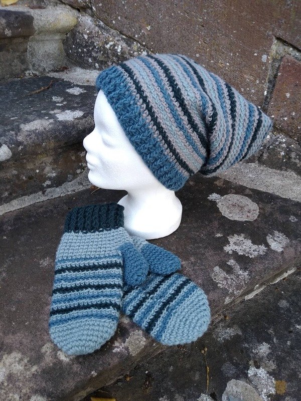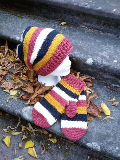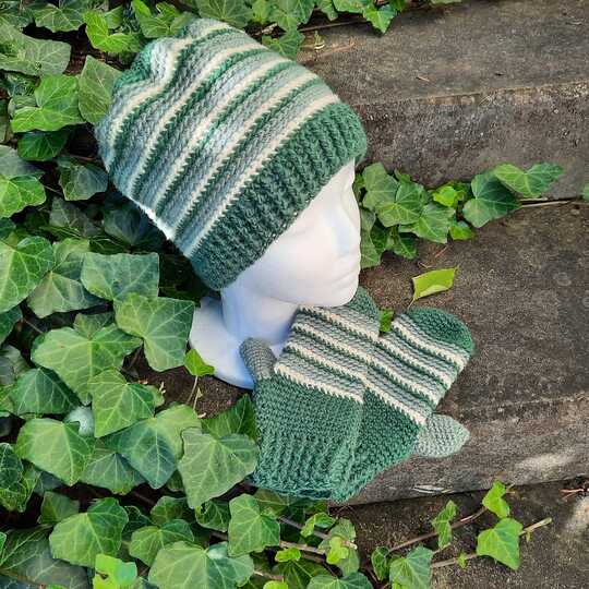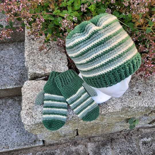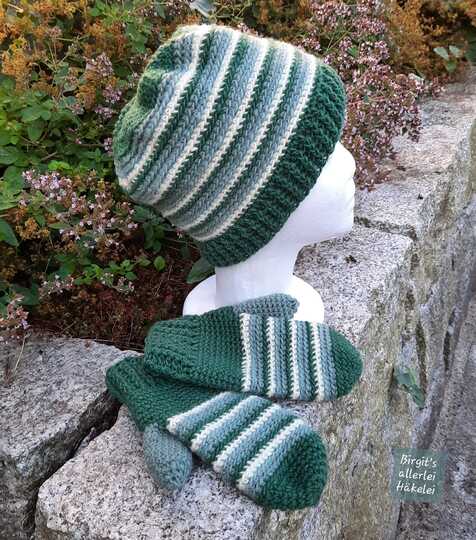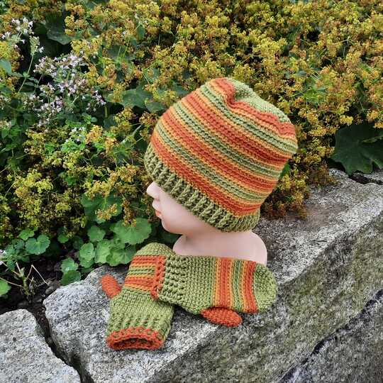 Ihr bekommt hier eine Häkelanleitung für ein Set, bestehend aus Mütze und Fäustlingen. Die bunten Streifen lassen viel Spielraum für eure Kreativität. Außerdem ist das Muster super geeignet um Wollreste zu verarbeiten.