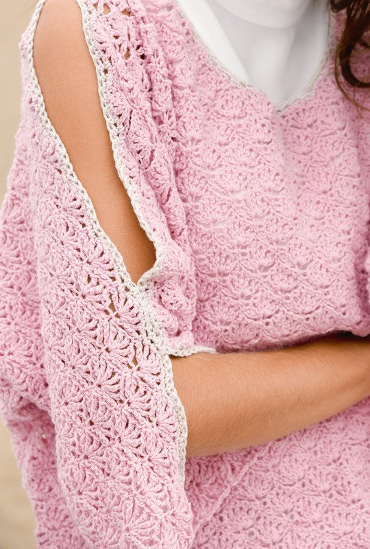 Was für ein Statement-Pulli! Im schmeichelnden Rosaton gehäkelt hat er eine lässige Weite und Länge. Das Muschelmuster sehr luftig. Es wird laut Häkelschrift mit Doppelstäbchen und Luftmaschen gearbeitet. Es ist nicht schwierig, man sollte nur genau zählen, um nicht mal eine Masche auszulassen. Ins Auge fällt gleich, dass der untere Teil zweifarbig gearbeitet wird. Die Fledermausärmel werden bei Vorderteil und Rückenteil gleich mitgehäkelt. Sind Vorder- und Rückenteil fertig, werden die Ärmrl-Schulter- und Ausschnittkanten in Sand mit festen Maschen umhäkelt. Anschließennd laut Schnittplan zusammennähen. Wem die Cut-Outs zu groß sind, der schließt auch hier die Nähte einfach etwas länger. Gehäkelt wird mit Nadel Nr 4 und einem Garn von Austermann. Die Anleitung ist für die Größen 36, 38, 40, 42, 44 und 46 beschrieben.