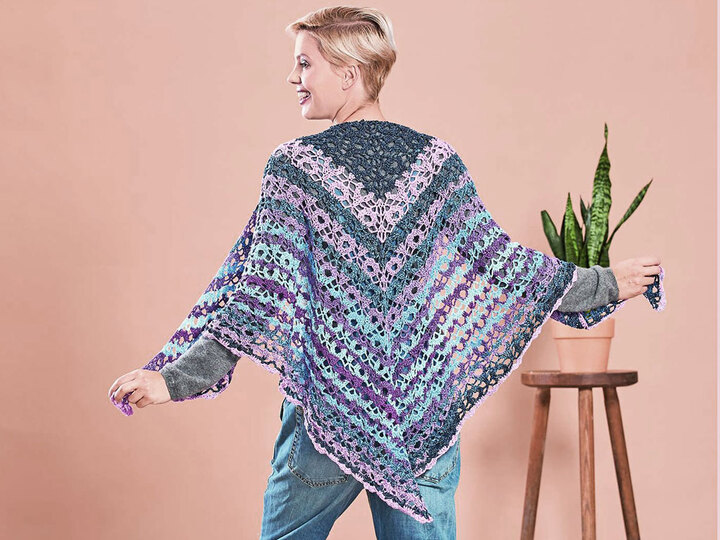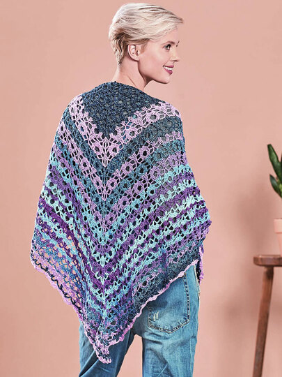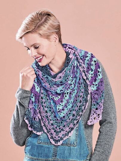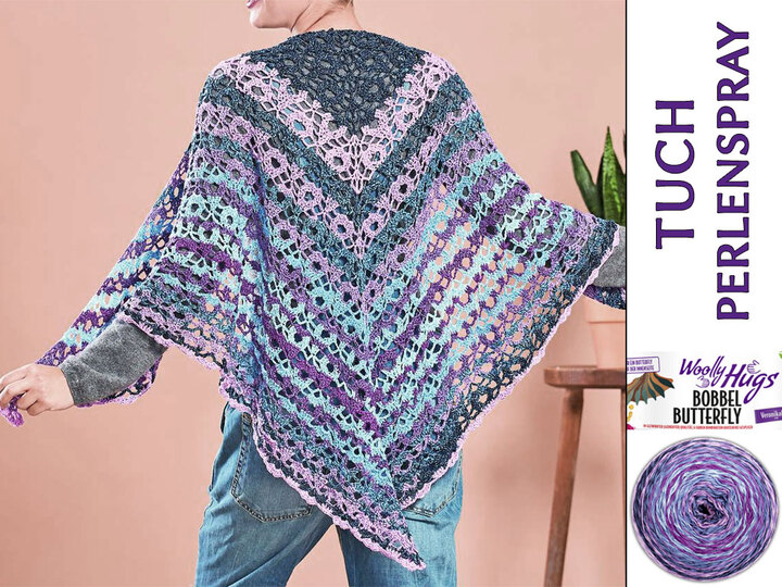 Ist dieses Tuch ein hübscher Hingucker! Dieses Tuch wird von der Mitte aus gehäkelt. Die Zunahmen sind mittig, sowie an beiden Seiten. So ensteht ein Tuch mit einem rechten Winkel. Das ist eine schöne Art, die Muster auf beiden Seiten symmetrisch entstehen zu lassen. Das Muster besteht aus 6 sich wiederholenden Reihen und kommt mit Stäbchen und Luftmaschen aus, ist also sehr anfängerfreundlich. Die Farbstreifen in sanften Flieder-, Lavendel - und Blautönen ergeben sich aus dem wunderbaren Garn Woolly Hugs Bobbel Butterfly, das es noch in anderen sehr schönen Farben gibt, ganz von selbst.