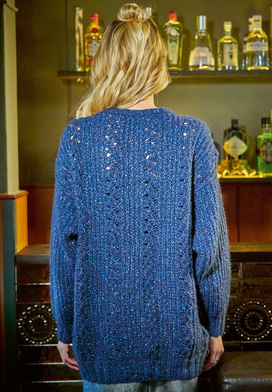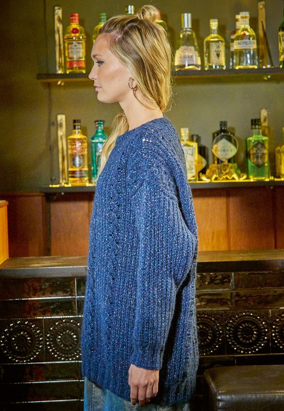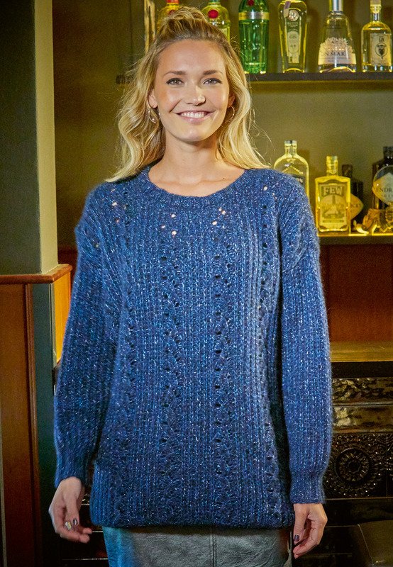 Dieser extra groß geschnittene Pullover hat im weichen Alpaka-Garn einen Lurex-Faden in leuchtendem Blau. So glitzert er schön, kratzt aber nicht auf der Haut. Er lässt sich wunderbar mit Samt und Leder kombinieren. Toll dazu sind Leggings und Overknee-Stiefel. Gestrickt wird in Einzelteilen mit einem Mix aus Halbpatent und Ajourmuster. Das Ajourmuster benötigt schon ein bisschen Konzentration, die klare Strickschrift hilft jedoch dabei, den Überblick zu behalten. Sind alle vier Teile fertig gestrickt, werden noch alle Nähte geschlossen und aus dem Halsausschnitt die schmale Blende im Rippenmuster herausgestrickt.