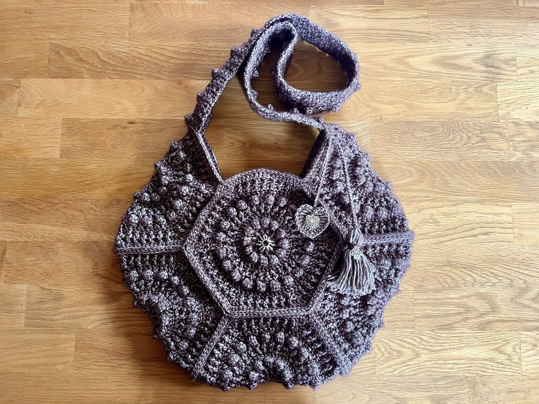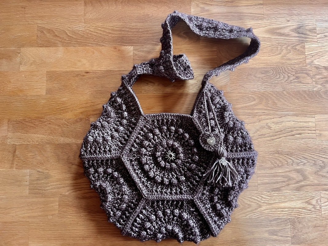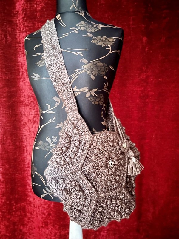 Schöne, stabile Umhängetasche im Boho Stil. Sie besteht aus 7 gleichen Hexagonen und einem Träger der an die fertige Tasche gehäkelt wird. Die Länge des Trägers kann den eigenen Wünschen angepasst werden.