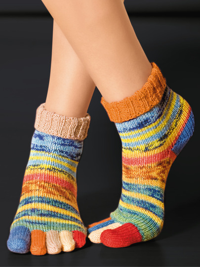 Hier bekommt jeder einzelne Zeh seine eigene Hülle, und noch dazu jeder in seiner eigenen Farbe. Wer sagt denn, dass ein Paar Socken identisch sein muss? Sie vertragen sich auch mit kleinen Unterschieden ausgezeichnet, ganz so wie es Hundertwasser immer gehalten hat. Er trug nie ein Paar Socken gleicher Farbe, darauf legte er Wert. Der kurze Schaft beginnt im Rippenmuster und wird dann glatt rechts gestrickt. Als Ferse wird eine Bumerangferse gearbeitet. Die Anleitung gibt es zum Download für die Strumpfgrößen 34/35 und 36/37.