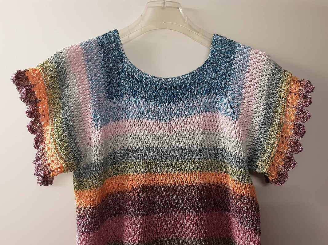 Die Tunika wird als RVO (Raglan von oben) in Runden gehäkelt. Sie beginnt am Halsausschnitt und wird von dort aus in Reihen ohne zu wenden nach unten gehäkelt. Der Brustbereich wird im alpinen Muster gehäkelt (1 Stb, 1 VRStb im Wechsel), was sehr blickdicht ist. Der restliche Teil ist luftig.