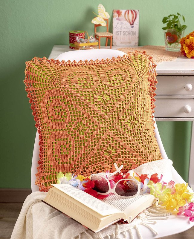 Die Anleitung umfasst ein Deckchen und ein Kissen mit Herzmuster. Beide Anleitungen sind Einzelanleitungen aus Filethäkeln Leichtgemacht 05/2021 und dürfen mit Genehmigung des Verlages hier veröffenticht werden.