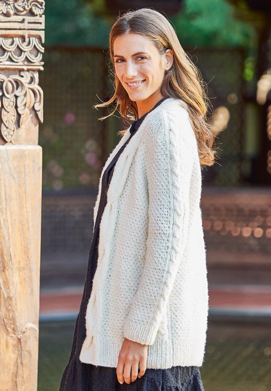 Das Perlmuster verträgt sich wunderbar mit Zöpfen, die sich hier als Blende um den Hals legen, die Seiten- und Schulternaht zieren und die hintere Mitte betonen. Die kleine verschlusslose Jacke wird entweder offen oder mit Gürtel getragen und ist eine Bereicherung für jeden Kleiderschrank. Gestrickt wird in einzelnen Teilen von unten nach oben. Das Perlmuster ist ganz einfach zu stricken und zudem in der Anleitung Reihe für Reihe beschrieben. Besonders praktisch: Die Zopfblende der Vorderteile wird gleich mitgestrickt. Auch das ist nicht kompliziert, die Verkreuzung findet nur alle 29 Reihen einmal statt. Hilfreich ist hier ein Reihenzähler – zusammen mit der klaren und übersichtlichen Strickschrift stellt auch die Blende keine große Herausforderung mehr dar. Zum Schluss nur noch alles zusammennähen und fertig ist der neue Lieblings-Cardigan!