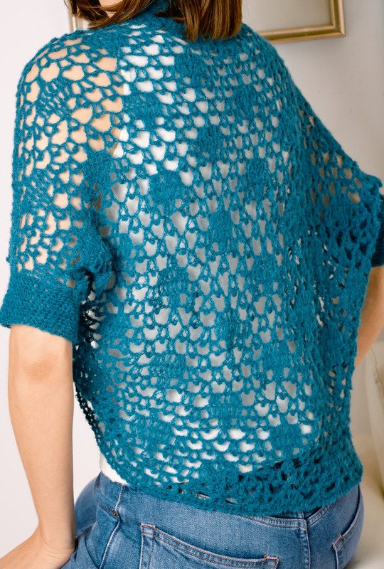 Taillenkurz ist dieser luftige Bolero. Er ist wirklich nicht schwer zu Häkeln. Das Muster bestehend aus Luftmaschen und Stäbchen. Si bekommt das Muster die Ajour Optik, die auf nackter Haut oder mit etwas hellem darunter getragen sehr gut zur Geltung kommt. Du häkelst ein ganz einfaches Rechteck. So hast du keine Zu- und Abnahmen. Im Anschluss nähst du die Seitennähte nach Plan zusammen, sodass die Ausschnitte für die Arme offenbleiben. An diese häkelst du dann Blenden aus festen Maschen, die den Seelenwärmer optisch abrunden. Du arbeitest mit Nadel Nr 4 und Garn von LANGYARNS. In der Anleitung findest du die Größe 36, 38, 40, 42, 44 und 46.