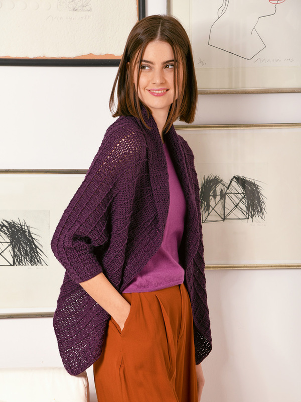 Was für eine außergewöhnliche Jacke! Das Muster setzt sich aus Stäbchen und Reliefstäbchen zusammen. Durch die Reliefstäbchen entsteht die Rippenoptik. Es sind doppelte Stäbchen die in den Hinreihen von vorne und in den Rückreihen von hinten um den Kopf des darunter liegenden Stäbchen gearbeitet werden. Das ist nicht weiter schwierig, nach ein paar Reihen hast du das Muster verinnerlicht. Besonderes Augenmerk liegt hier auf dem Schnitt. Der untere Teil ist relativ kurz, dafür ist die Raglanschrägung um so tiefer. Hier musst du genau nach Anleitung arbeiten. Du häkelst über alle Maschen und nimmst betont an 8 Stellen ab. Auch hier spielen die Reliefstäbchen wieder eine Rolle. Zum Schluss umhäkelst du für die Blenden noch den Ausschnitt und die Vorderteilkanten. Du arbeitest mit einer Häkelnadel Nr 3,5 und Garn von ggh. In der Anleitung findest du die Größen 36, 38, 40, 42, 44 und 46.