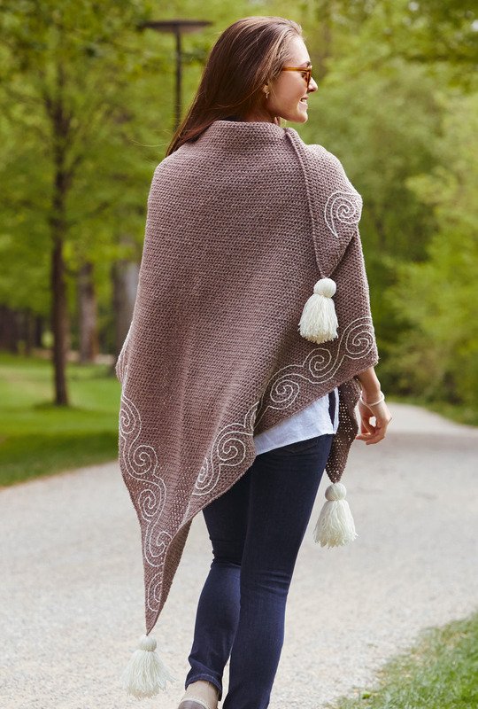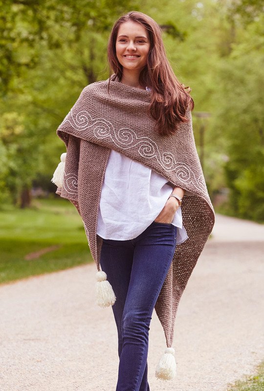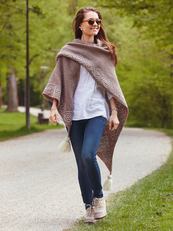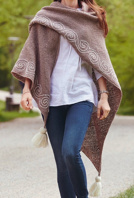 Mit diesem großen, gehäkelten Umschlagtuch in Beige kommt man gut durch den Winter. Im simplen Halb-Stäbchenmuster gehäkelt ist es schnell fertig und es wird im Nachhinein an den Querkanten wunderschön bestickt. Für das Motiv gibt es eine Vorlage, die, nachdem sie vergrößert wurde, auf die zu bestickenden Kanten übertragen wird. Die Linien werden dann in Natur, im Korallenstich, nachgestickt. Auch für den plastischen Stich liegt eine Anleitung vor. Der besondere Clou sind die superdicken Quasten an den Ecken. Das Wollgarn ist von Lana Grossa und es wird mit Häkelnadel Nr 5 verarbeitet. Fertig hat dein Tuch eine Größe von 130 x 187 cm.