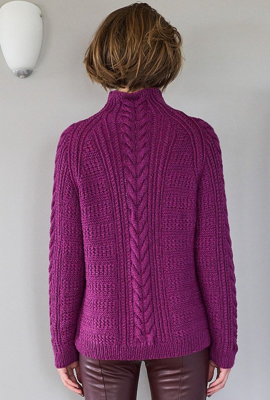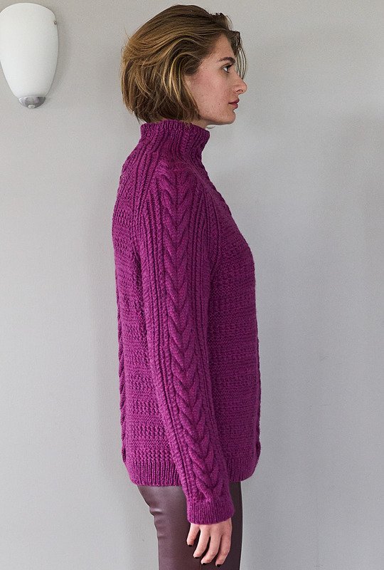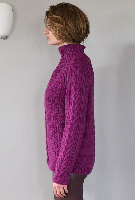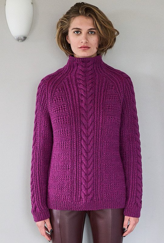 Bei diesem lässigen Raglanpulli aus griffiger Merinowolle zieht die eindrucksvolle Mustereinteilung Blicke auf sich: In der Mitte ein plastischer Zopf, daneben Längs- und Querrippen sowie an den Seitenkanten ein schmaler Zopf, der sich entlang der gleichmäßigen Raglanschrägungen fortsetzt und bis in den hohen Stehkragen führt. Diese perfekt ausgearbeitete Optik sieht nicht nur toll aus, sondern erfordert etwas Geduld und ist somit Nadelkünstlern vorbehalten.