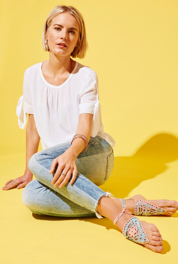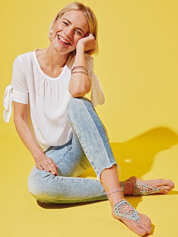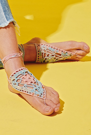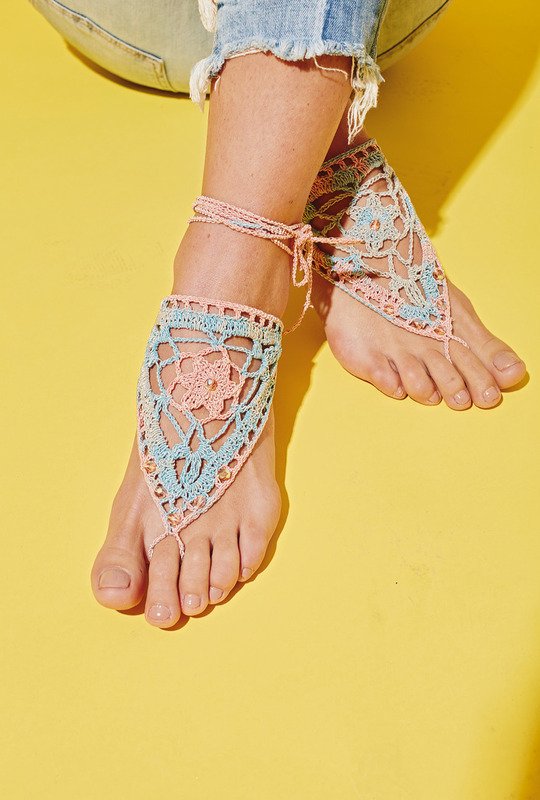 Eigentlich benötigt man ihnnicht, aber wenn man ihn hat, ist er besonders schön: gehäkelter Fußschmuck, der ganz schnell noch vor dem Urlaub fertig wird. Du brauchst dafür nur zwei Dreiecke zu häkeln. Für diese gibt es eine exakte Häkelschrift, also kein Problen. Bist du mit dem Häkeln fertig, dann kannst du den Fußschmuck, wie hier auf der Abbildung, mit Perlen verzieren. Zum Schluss musst du dann nur noch die Zehenschlinge und Bindebänder auf Luftmaschenketten arbeiten. Fertig ist der neue Hingucker für den Strand. Du häkelst mit Nadel Nr 2 und Garn von ONline. Die schönen Perlen zum Verziehen beommst du bei Rayher Hobbykunst.