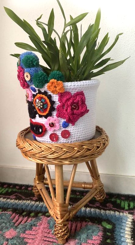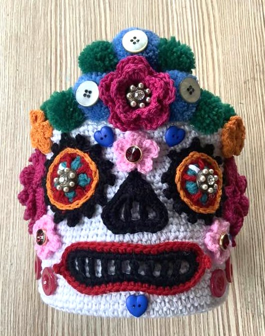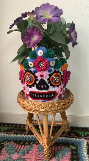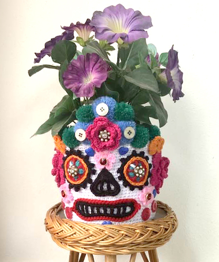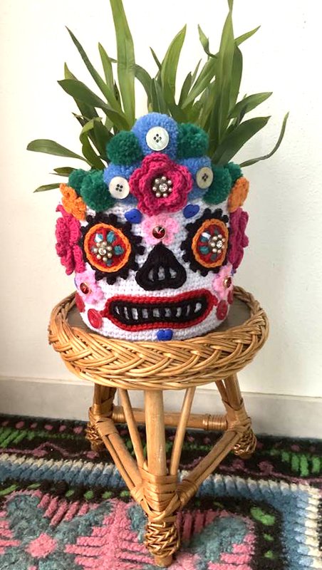 Übertopf/Utensilo „Mein Name ist Topf...Über Topf!.“..einte tolle Handarbeit und auch echt flott gehäkelt..super als Geschenk..sieht sehr lustig aus....und Du kannst Deine ganzen Wollereste verbrauchen.....“Dias de los muertos„