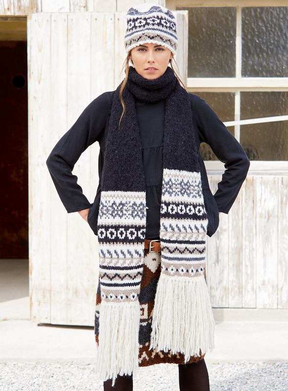 Extralang sind nicht nur die Fransen an diesem Schal, sondern auch der Schal selbst. Man kann ihn mühelos mehrmals um den Hals wickeln, und da das Garn schön voluminös ist, wird er trotz seiner Länge mit Nadelstärke 7 und 8 schnell fertig. Die Mütze im Allover-Jacquard-Muster macht daraus ein perfektes Set, das uns wunderbar durch den ganzen Winter bringt. Gestrickt wird der Schal in Hin- und Rückreihen, wobei der Patentrand dafür sorgt, dass sich nichts einrollt. Die Jacqardmuster benötigen durchaus etwas Konzentration, wobei die übersichtlichen Strickschriften dabei helfen, stets den Überblick zu behalten. Die Mütze wird in Runden gestrickt, wobei die formgebenden Abnahmen in der Krone erfolgen.