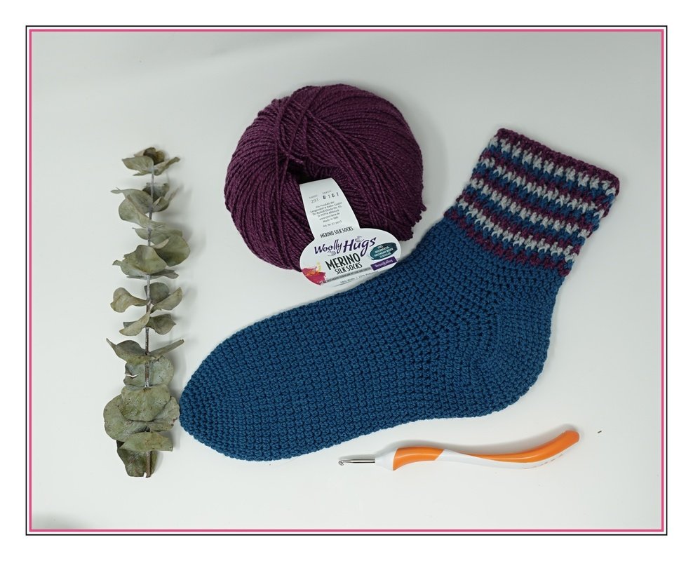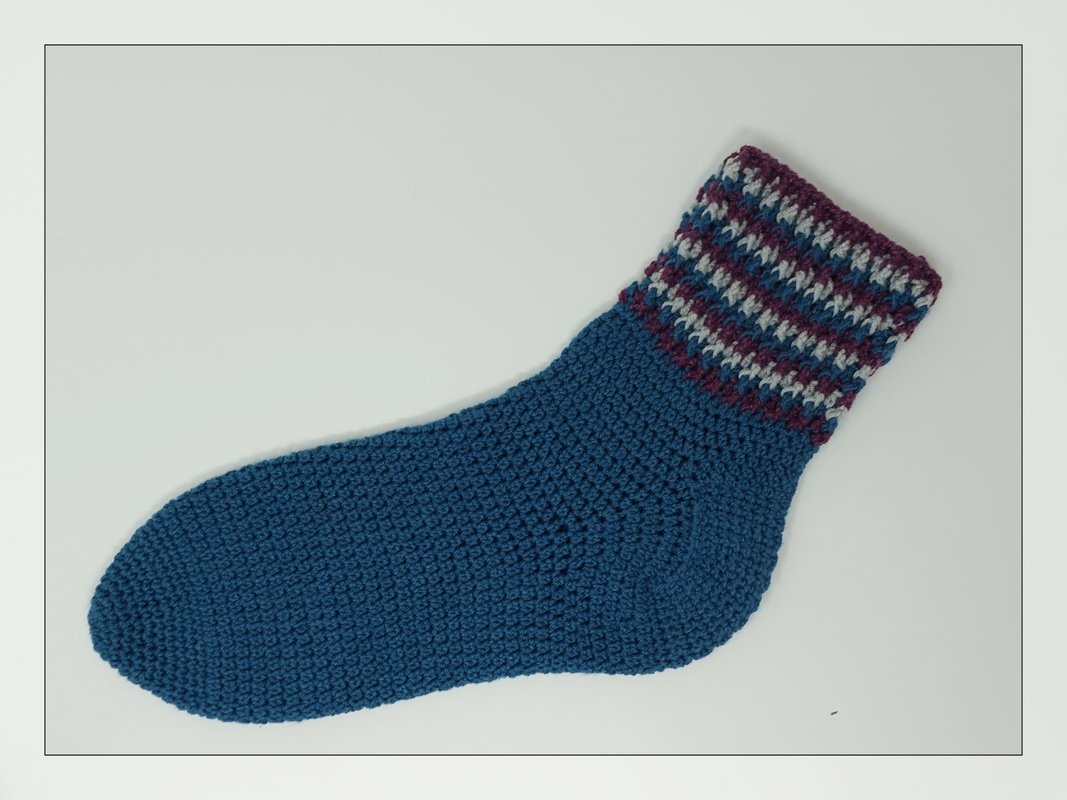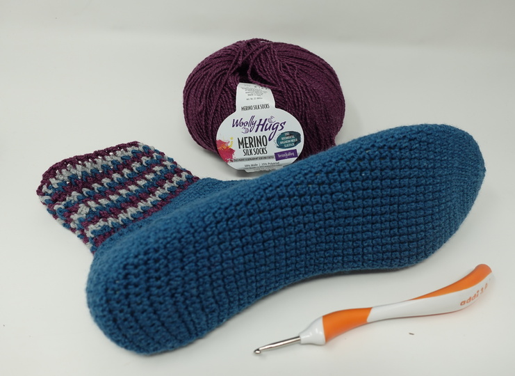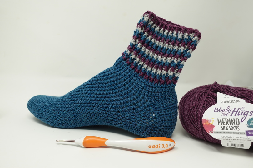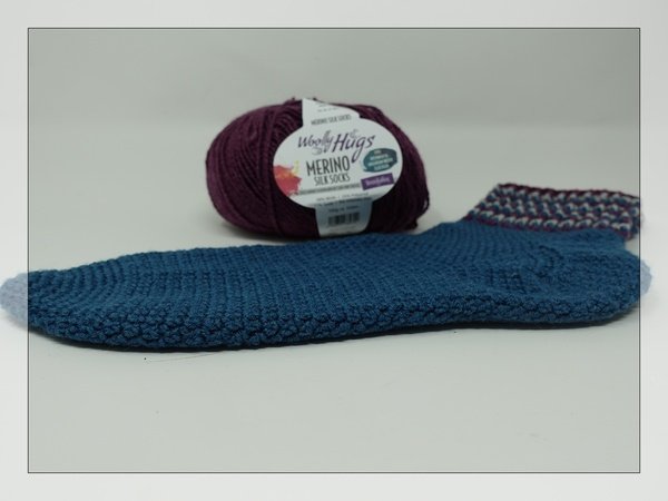Material: MERINO SILK SOCKS von Woolly Hugs (58% Wolle, 25% Polyamid, 11% Seide, 6% Elasthan, LL = 420 m/100 g) 100 g in Wunschfarbe plus 2 Farbreste - beim Original wurde als