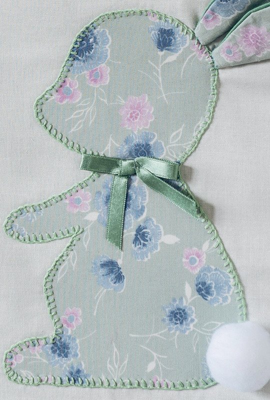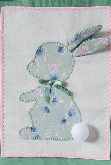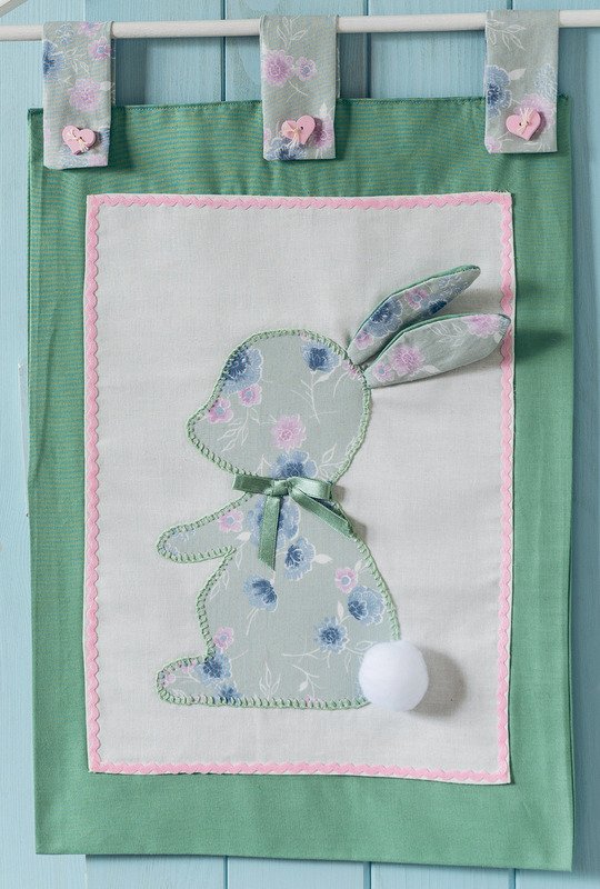 An der Haustür, der Kinderzimmerwand oder in der Küche macht sich dieser kleine Wandbehang, an einem Kleiderbügel aufgehängt, besonders gut. Der Hintergrund ist auch für wenig Geübte einfach zu nähen. Das Häschen wird mit Langettenstich appliziert oder einfach mit der Nähmaschine mit einem schmalen Zickzackstich aufgenäht. Ohren und Pompon-Schwänzchen und auch die Satinschleife heben sich dreidimensional hervor. Drei Aufhänger sind mit herzigen Knöpfen angebracht. Wer den Wandbehang zum Verstauen oder Wegräumen abnehmen will, näht Knopflöcher an. Der fertige Wandbehang hat eine Größe von 32 x 44 cm.