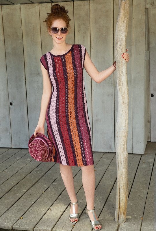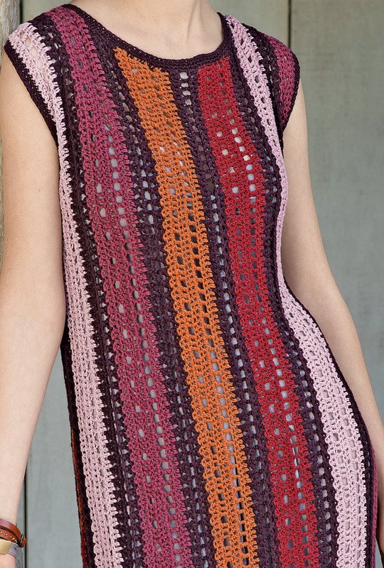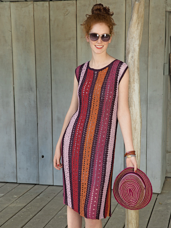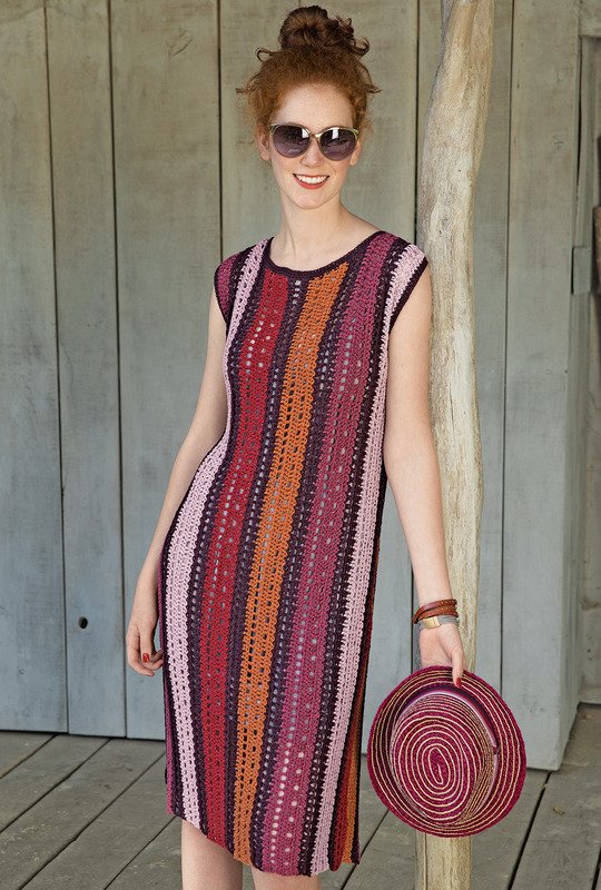 Mehr Sommer geht nicht! In diesem ärmellosen, knielangen Häkelkleid wirst du dich überall wohl fühlen. Ob mit High Heels zur Party oder mit Flip Flops am Strand, es macht einfach alles mit. Ideal dafür ist das Leinengarn, dass es in vielen wunderschönen Farben gibt. Für das Kleid wurden harmonische Rottöne rausgesucht, die in Streifen verarbeitet werden. Der Trick dabei ist, dass du das Kleid quer, also von Seitennaht zu Seitennaht häkelst. Das Muster, für dass du Stäbchen und Luftmaschen arbeitest ist nicht schwer. Luftige Akzente setzen die Reihen mit zusammengehäkelten Stäbchen. Beim Zusammennähen lässt du für die seitlichen Schlitze die unteren Seitennähte offen. Der Ausschnitt und die Armausschnitte werden mit festen Maschen umhäkelt. Du häkelst mit Nadel N 4,5 und Garn von Langyarns. In der Anleitung findest du die Größen 38, 40 und 42