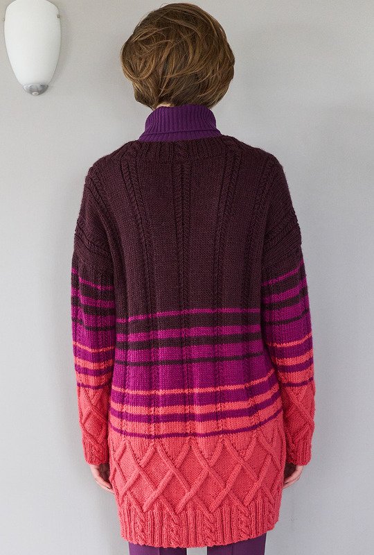 Unten hell, oben dunkel – diese Farbmischung aus Himbeere, Zyklam und Bordeaux wirkt streckend und macht immer ein gute Figur. Dazu kommt natürlich noch das raffinierte Musterspiel: Du beginnst im unteren Teil mit markanten Rautenstrukturen, in der Mitte kommt ein spannendes Streifendesign in die Masche und oben – sozusagen zum Ausruhen – enden die Teile im bordeauxroten Zopf-Rippenmix. So entsteht aus strapazierfähiger Schurwolle ein aparter Longpulli, der Aufmerksamkeit erregt und gute Laune macht.