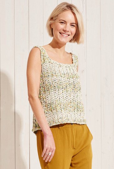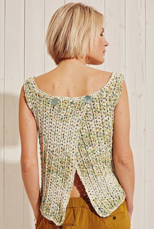 Schaut man von vorne, dann sieht man einen klassischen Pullunder. Ein breiter, eckiger Ausschnitt, tief, aber nicht zu tief und schmale Schultern. Von hinten aber ist er alles andere als klassich. Das geteilte Rückenteil hat einen Übertritt von 6 cm und ist nur oben von zwei Knöpfen gehalten. So kann es nach unten wie ein V auseinanderschlagen. Das Muster für diesen Pullunder ist einfach, aber mit großer Wirkung. Die Reliefstäbchen lassen das Muster in Rippen erscheinen. Sie rahmen die dazwischenliegenden Stäbchengruppen, die immer in eine Masche gehäkelt werden ein. Die Kanten, mit Krebsmaschen umhäkelt geben dem Ganzen einen schönen Rahmen. Du häkelst mit Nadel Nr 3 die Umrandung und Nadel Nr 4 das Muster. Der Pullunder wird mit Garn von Langyarns gearbeitet. In der Anleitung findest du die Größe 34, 36, 38, 40, 42, 44.