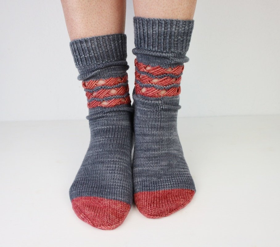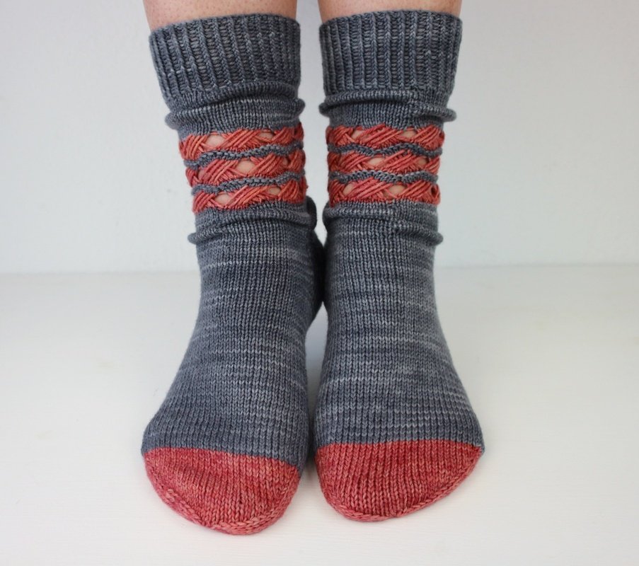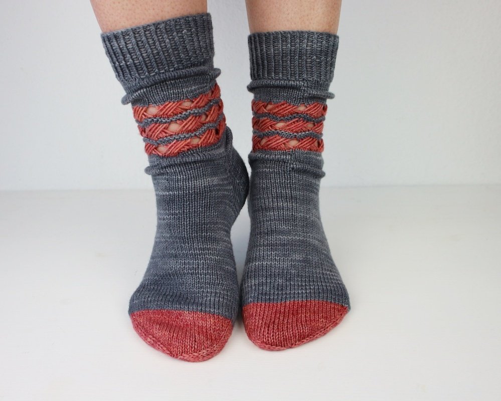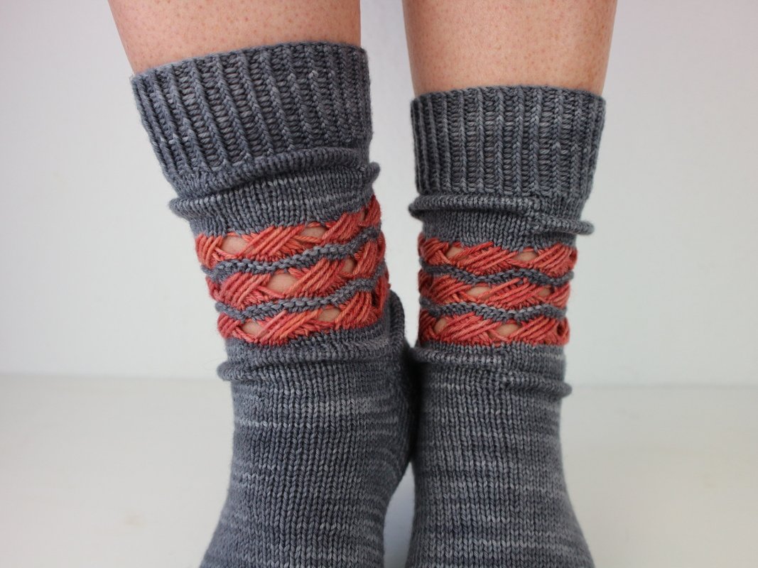 Die Socken werden vom Bündchen abwärts gestrickt. Die Ferse ist eine Käppchenferse und den Abschluss bildet die Bandspitze.