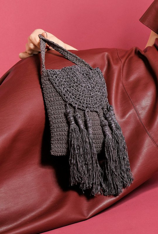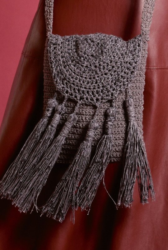 Eine Tasche für alle Gelegenheiten. Sie wird aus zwei verschiedenen Garnen gehäkelt. Diese werden immer doppelt verarbeitet. So hat die Tasche eine größere Stabilität. Für den Korpus häkelst du einfach in festen Maschen. 20 breit und 40 cm gerade hoch. Anschließend legst du ihn zur Hälfte zusammen und nähst die Seitennähte zusammen. Nun folgt die etwas aufwendigere Klappe. Hier häkelst du mit dem anderen Garn. Die Klappe wird halbrund gearbeitet. Du häkelst von der Querkante an nach rechts und links und nimmst immer in der Mitte Maschen zu. Klingt kompliziert, aber da Du nach Häkelschrift arbeitest ist es gar nicht so schwer. Für das Finish benötigst du dann noch den Schulterriemen und die Bommel, fertig ist deine neue Traumtasche. Du häkelst mit Nadel Nr 5 und Garn von Lana Grossa. Die fertige Tasche hat eine Größe von 18 x 20 cm.