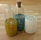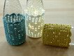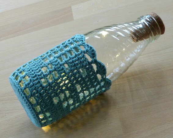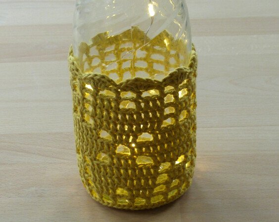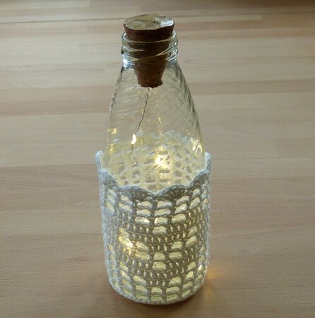 Bei Verwendung von Baumwollgarn mit einer Lauflänge von 125m/50g und Nadelstärke 3 passen die Bezüge für Flaschen und Gläser mit 7 cm Durchmesser und mindestens 9 cm Höhe. Für Gläser können batteriebetriebene Teelichter benutzt werden, für Flaschen gibt es spezielle LED-Lichterketten mit Korken.