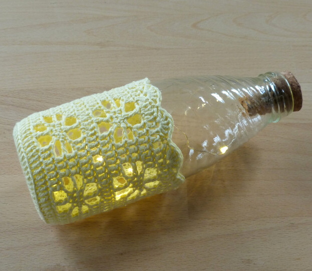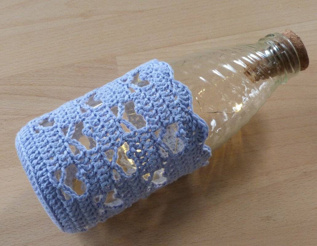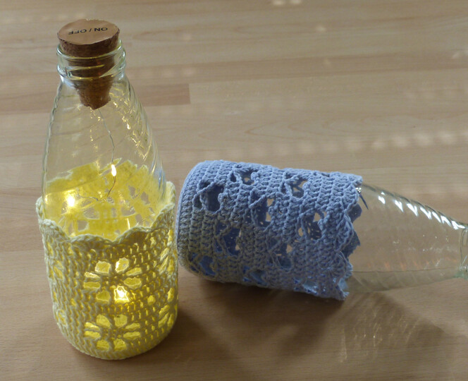 Bei Verwendung von Baumwollgarn mit einer Lauflänge von 125m/50g und Nadelstärke 3 passen die Bezüge für Flaschen und Gläser mit 7 cm Durchmesser. Für Gläser können batteriebetriebene Teelichter benutzt werden, für Flaschen gibt es spezielle LED-Lichterketten mit Korken.